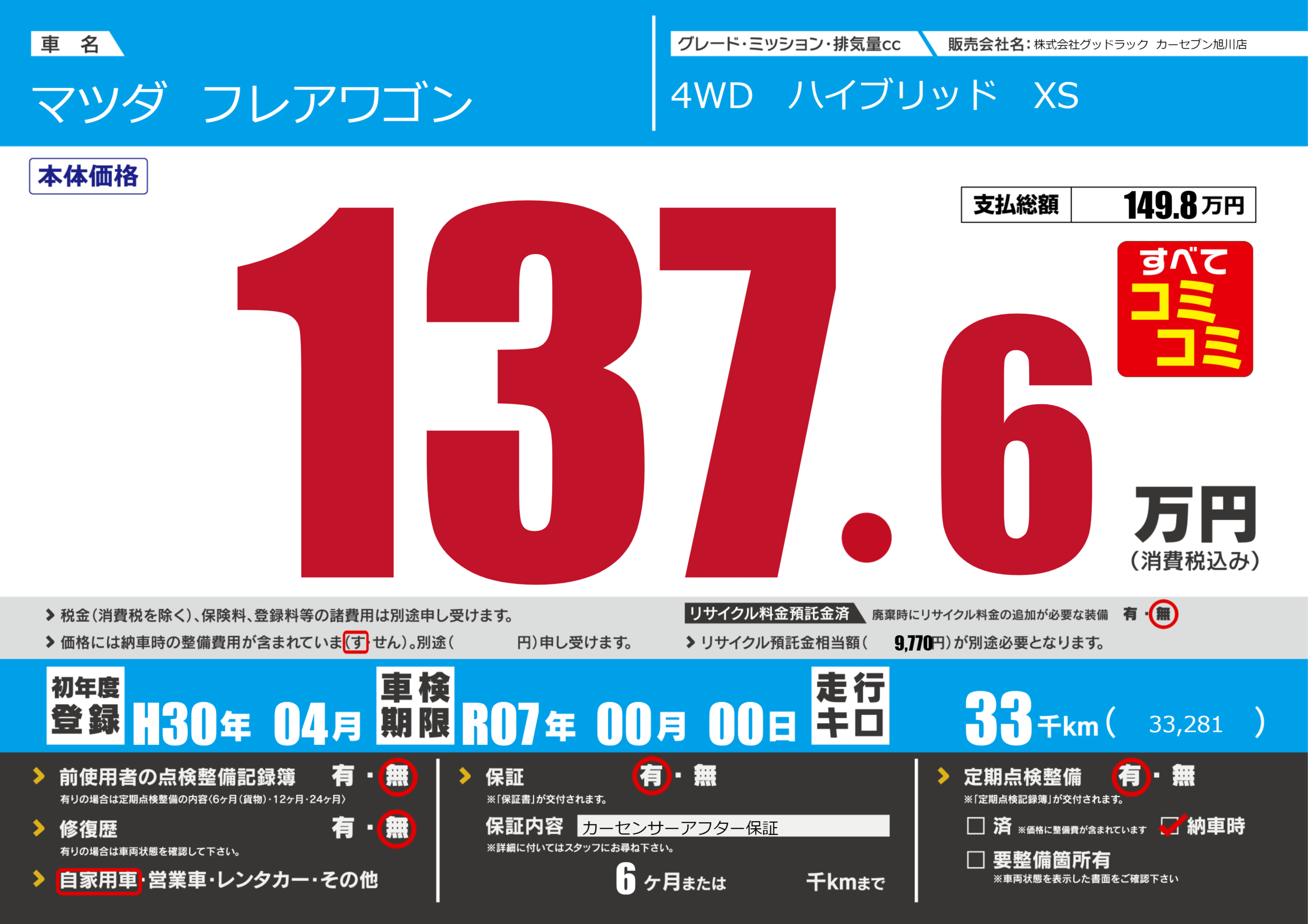 | 車検制限 | R07年 00月 00日 | ||