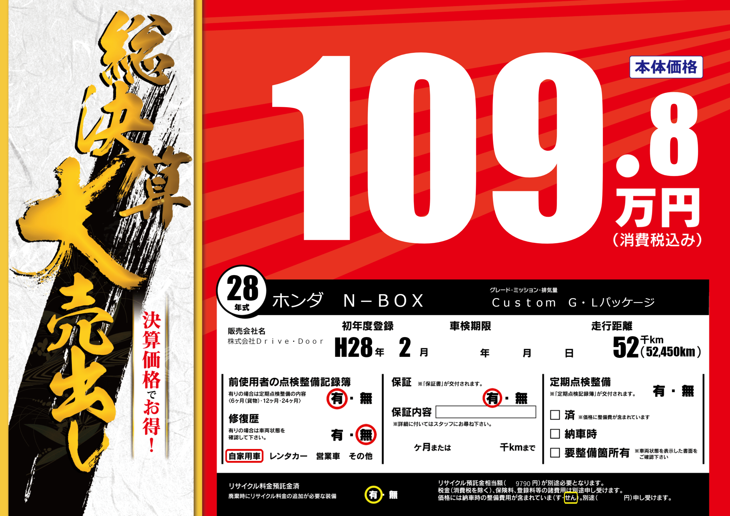 | 車名 | ホンダ N-BOX | グレード ミッション 排気量 |