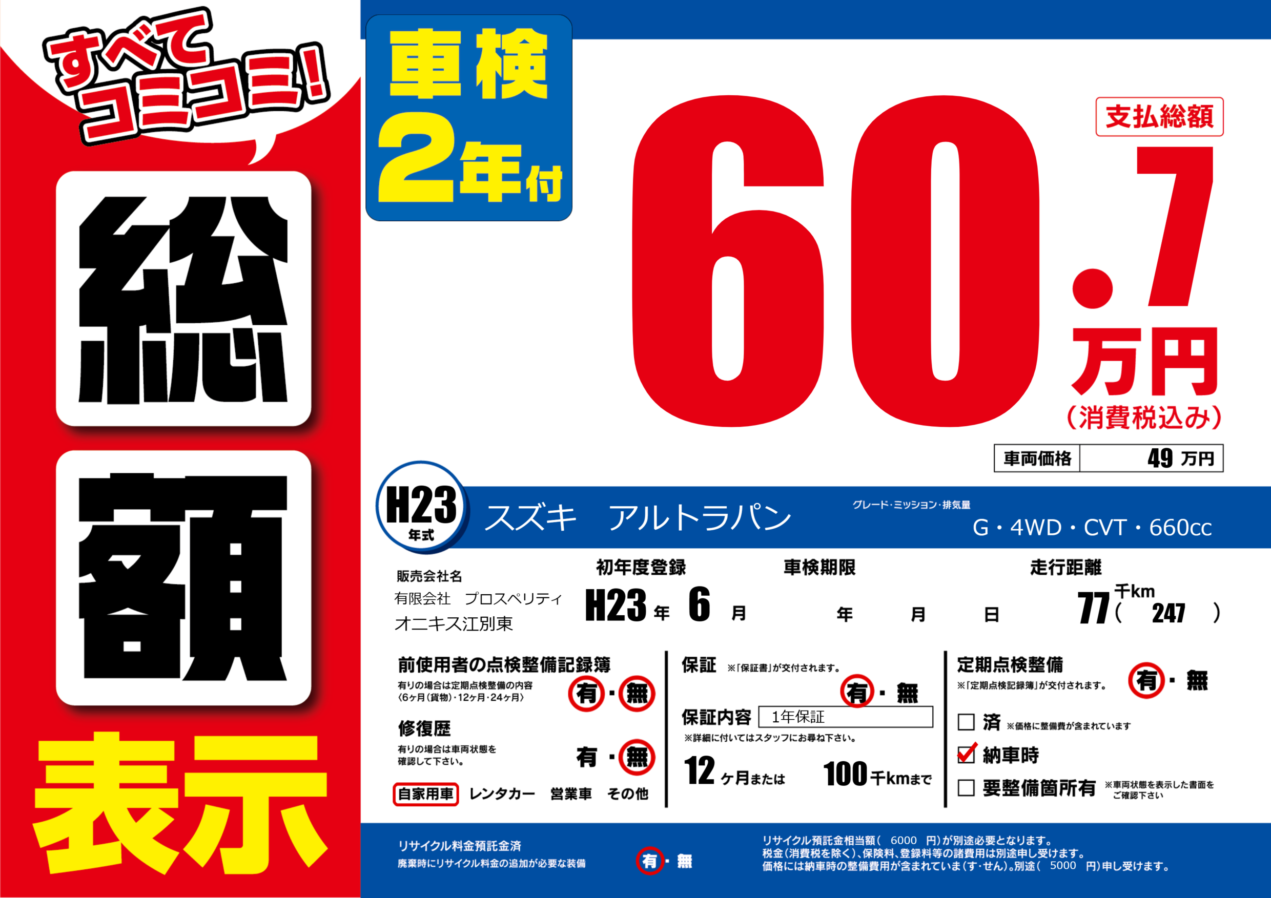 | 走行キロ | 7.7万km | 初年度登録 | H23年6月 |