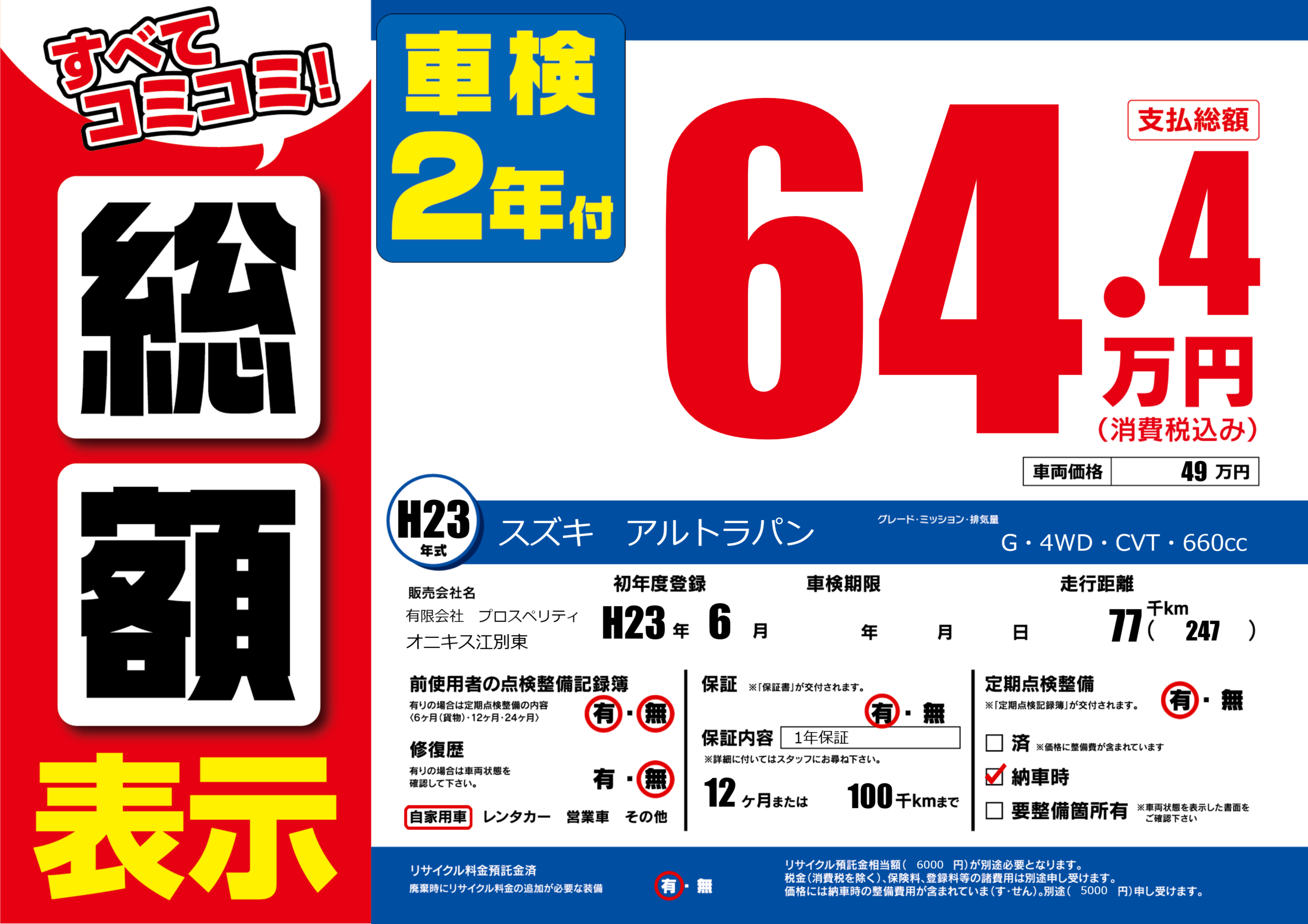 | 走行キロ | 7.7万km | 初年度登録 | H23年6月 |