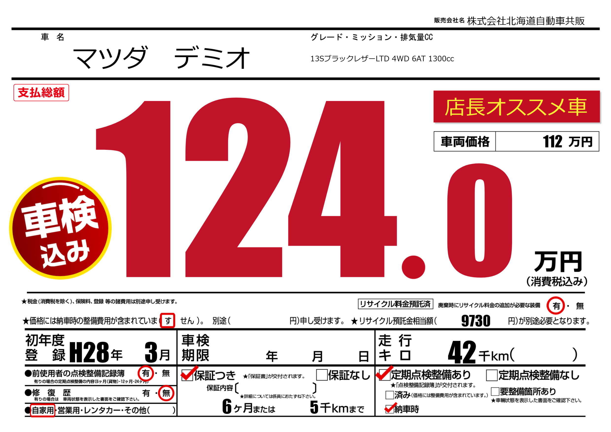 | 車名 | マツダ デミオ | グレード ミッション 排気量 |