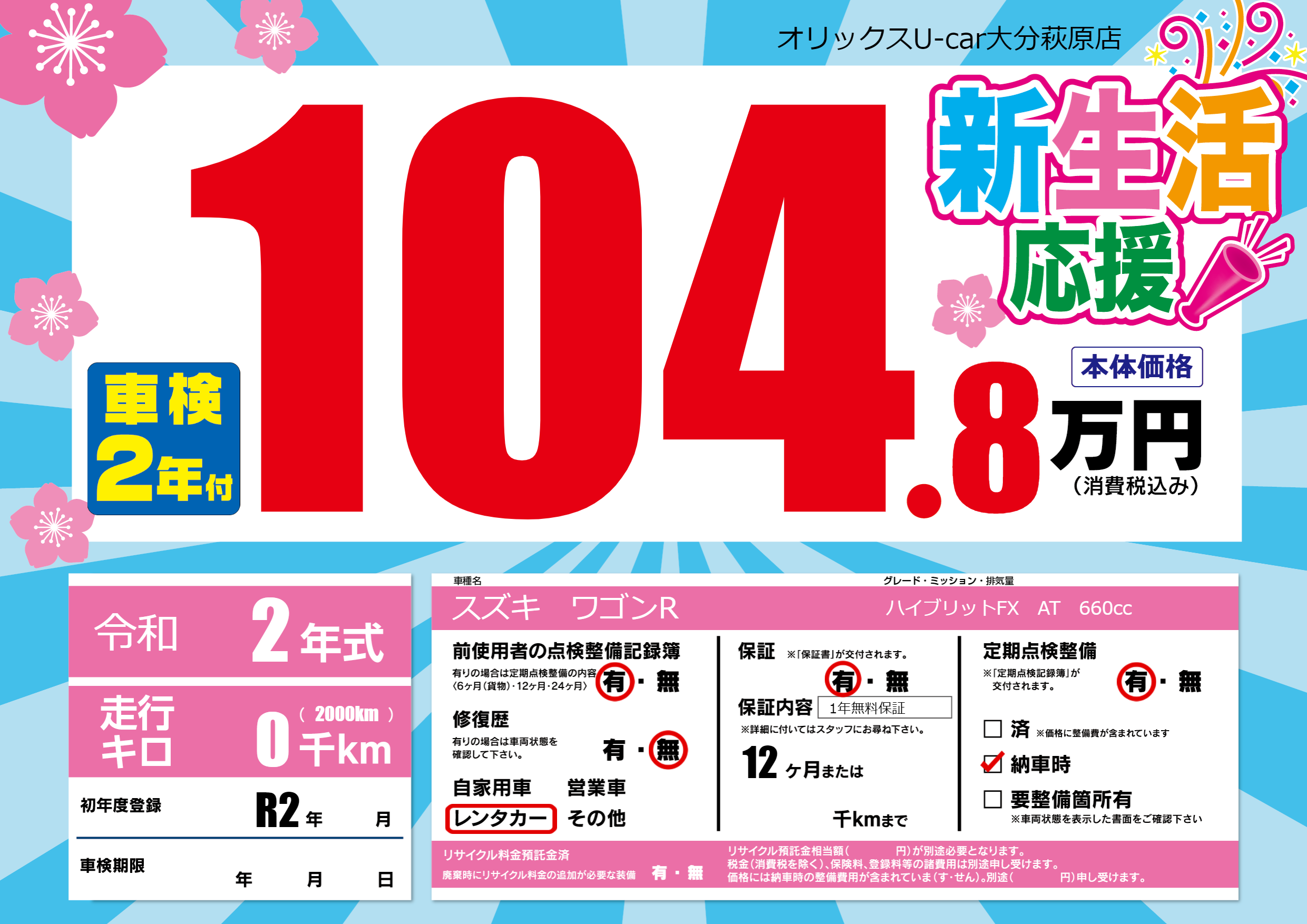 保証付き 保証内容(1年無料保証) 12ヶ月または()千kmまで |