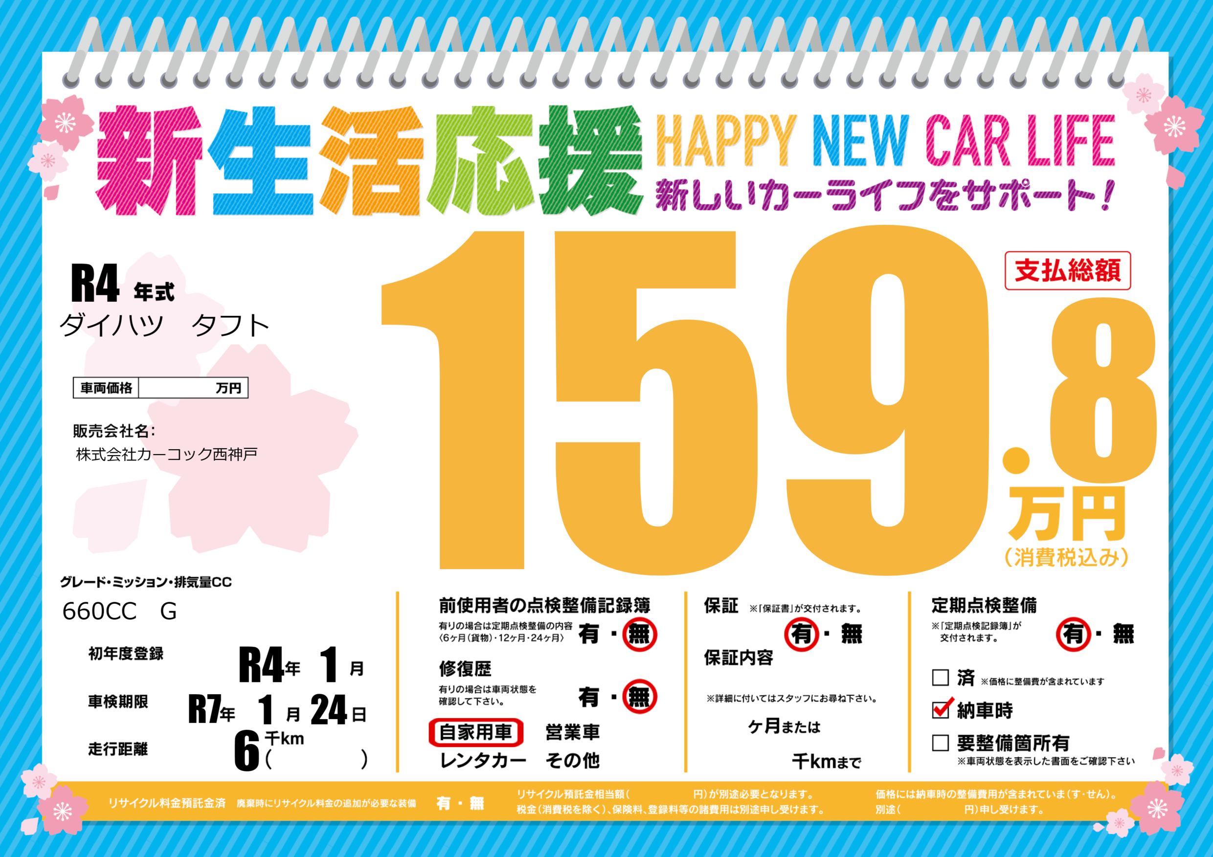 | 定期点検整備 | 定期点検整備あり 納車時あり | ||