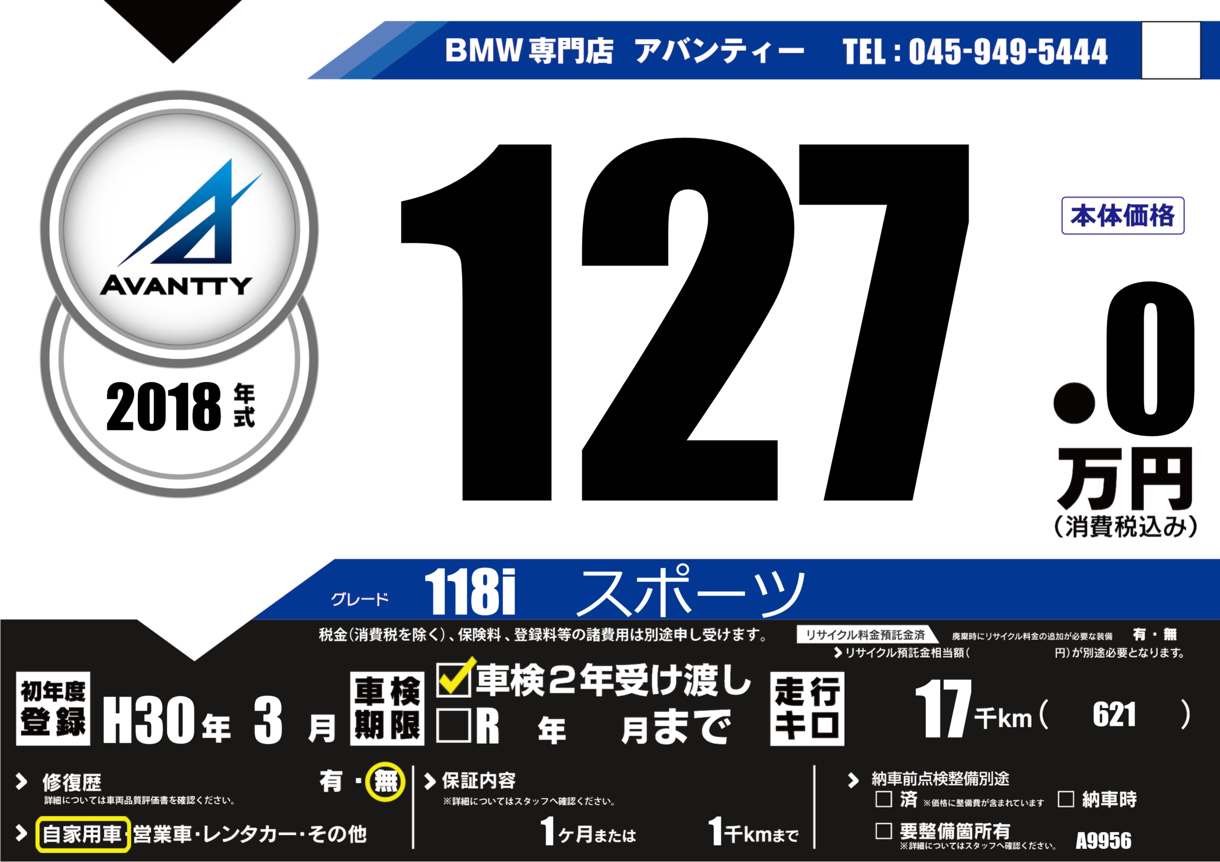 | 走行キロ | 1.7万km | 初年度登録 | H30年3月 |