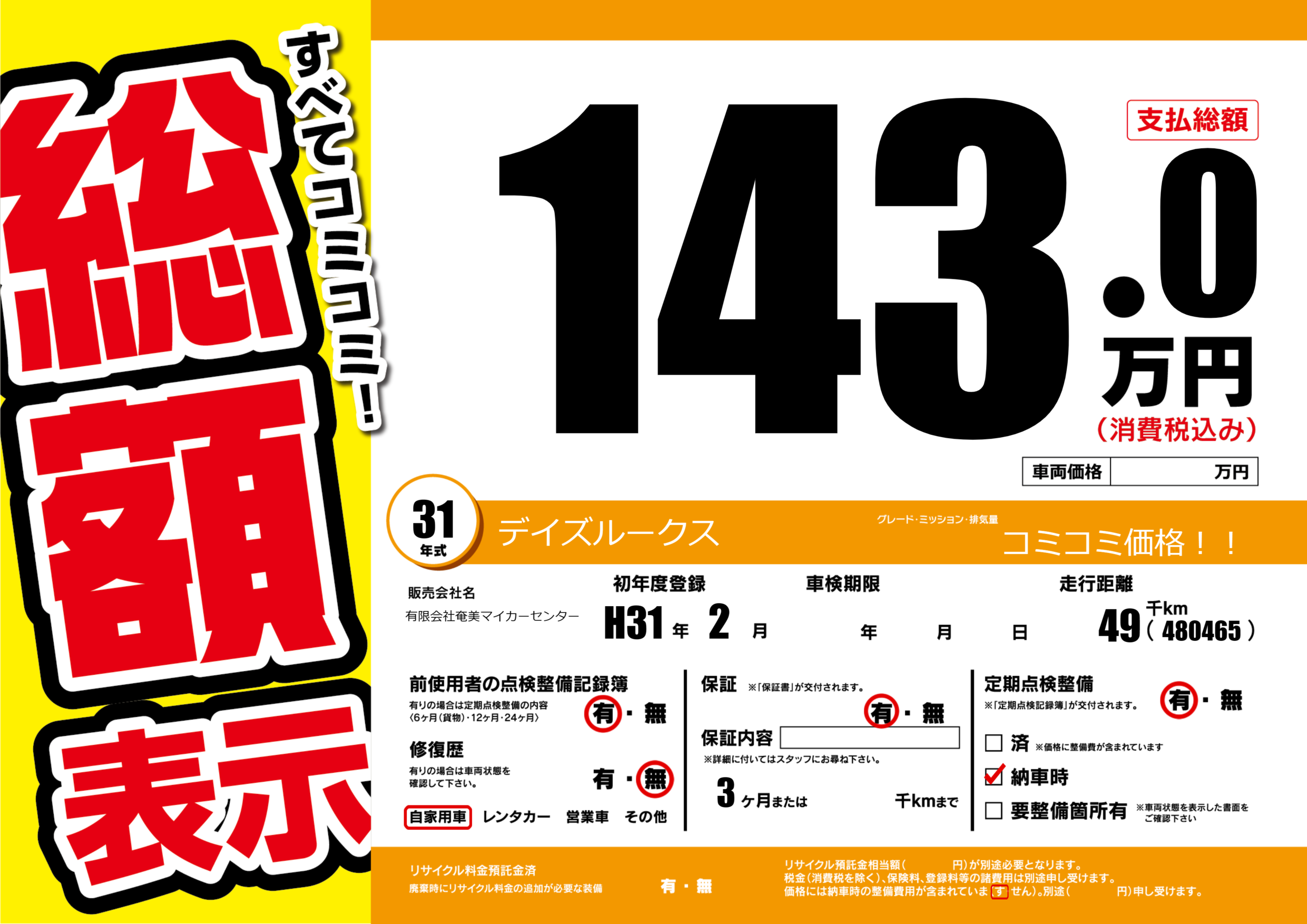 | 定期点検整備 | 定期点検整備あり 納車時あり | ||