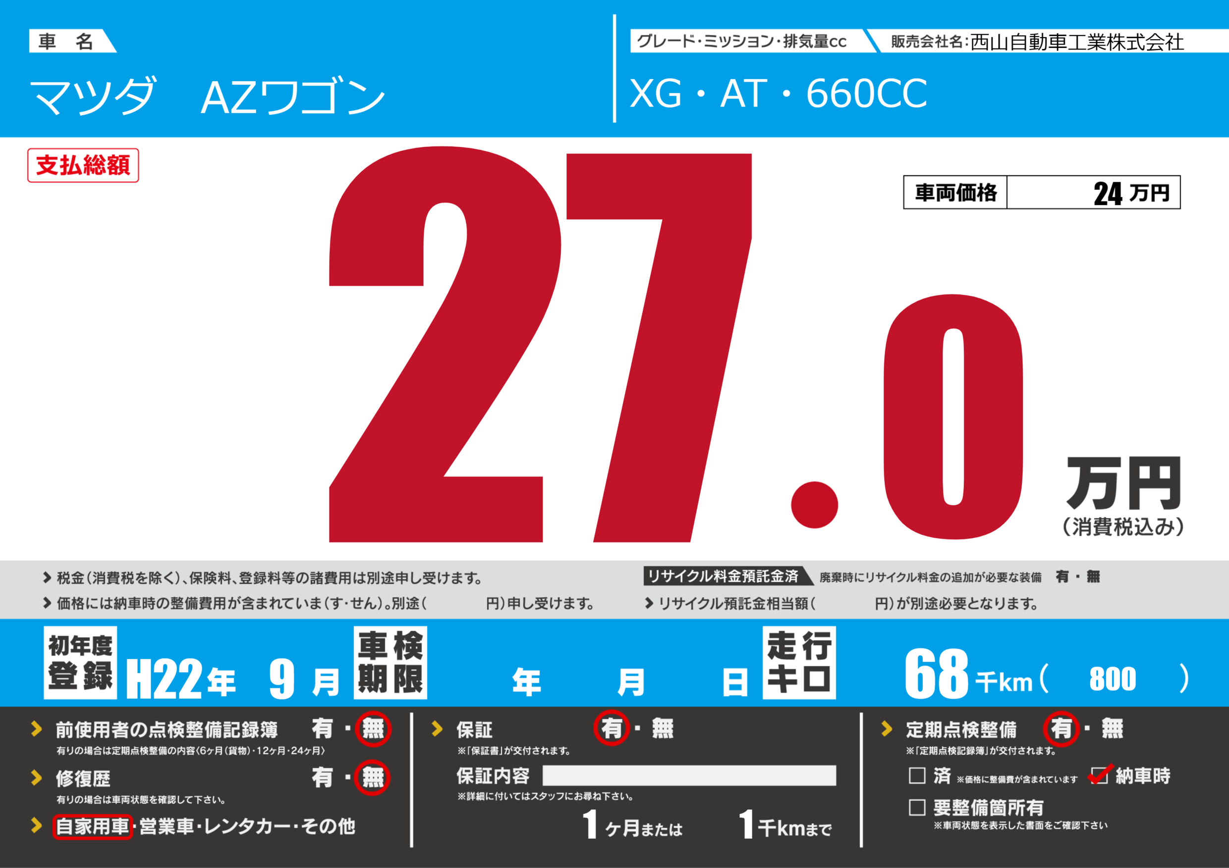 | 車名 | マツダ AZワゴン | グレード ミッション 排気量 |