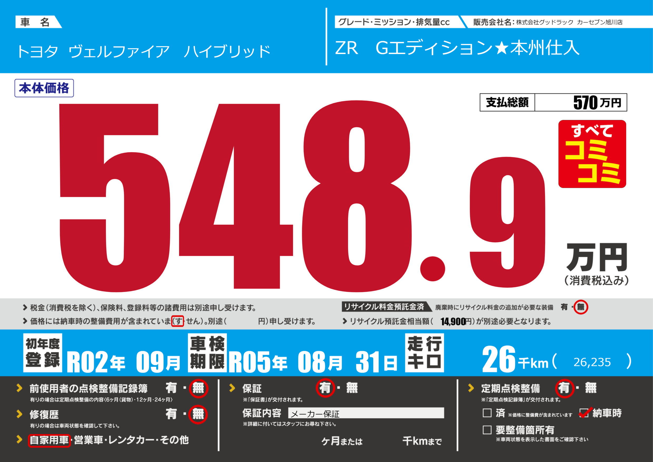 | 走行キロ | 2.6万km | 初年度登録 | R02年09月 |