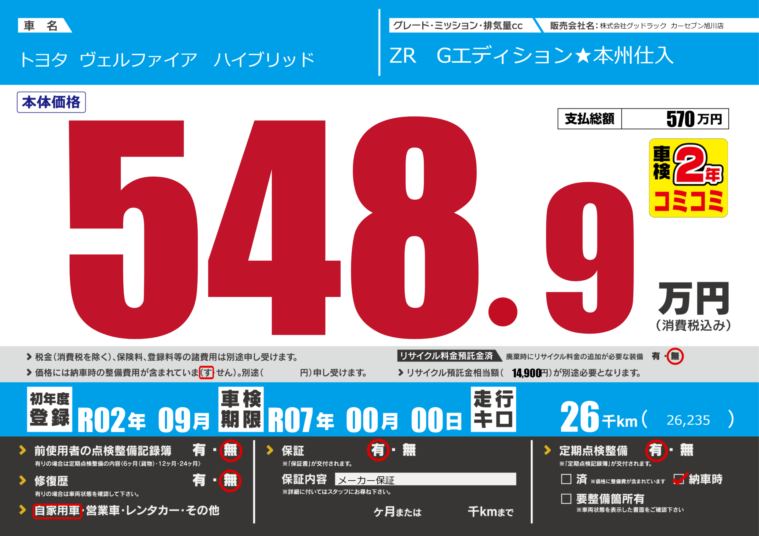 | 走行キロ | 2.6万km | 初年度登録 | R02年09月 |