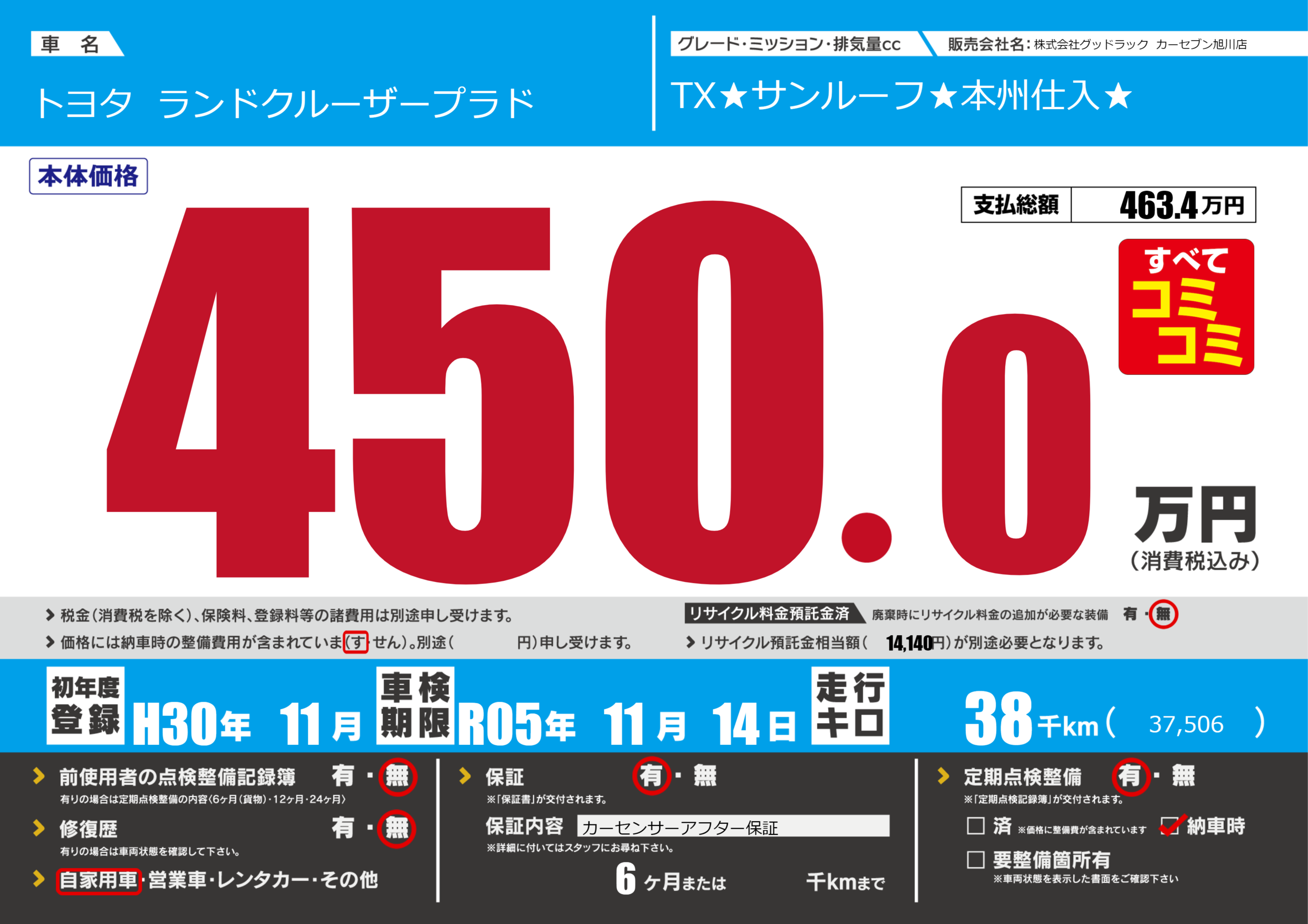 | 車名 | トヨタ ランドクルーザープラド | グレード ミッション 排気量 |