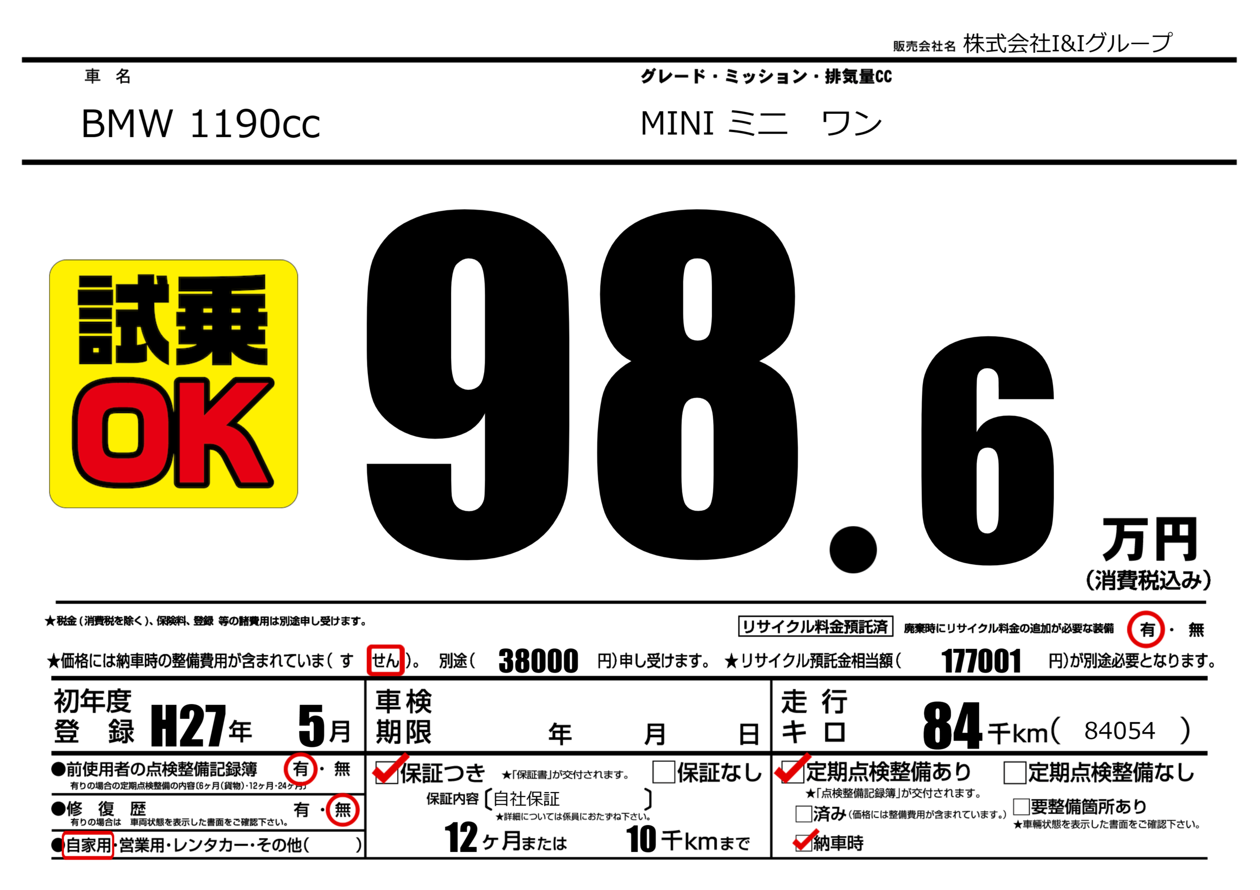 | 車名 | BMW 1190cc | グレード ミッション 排気量 |