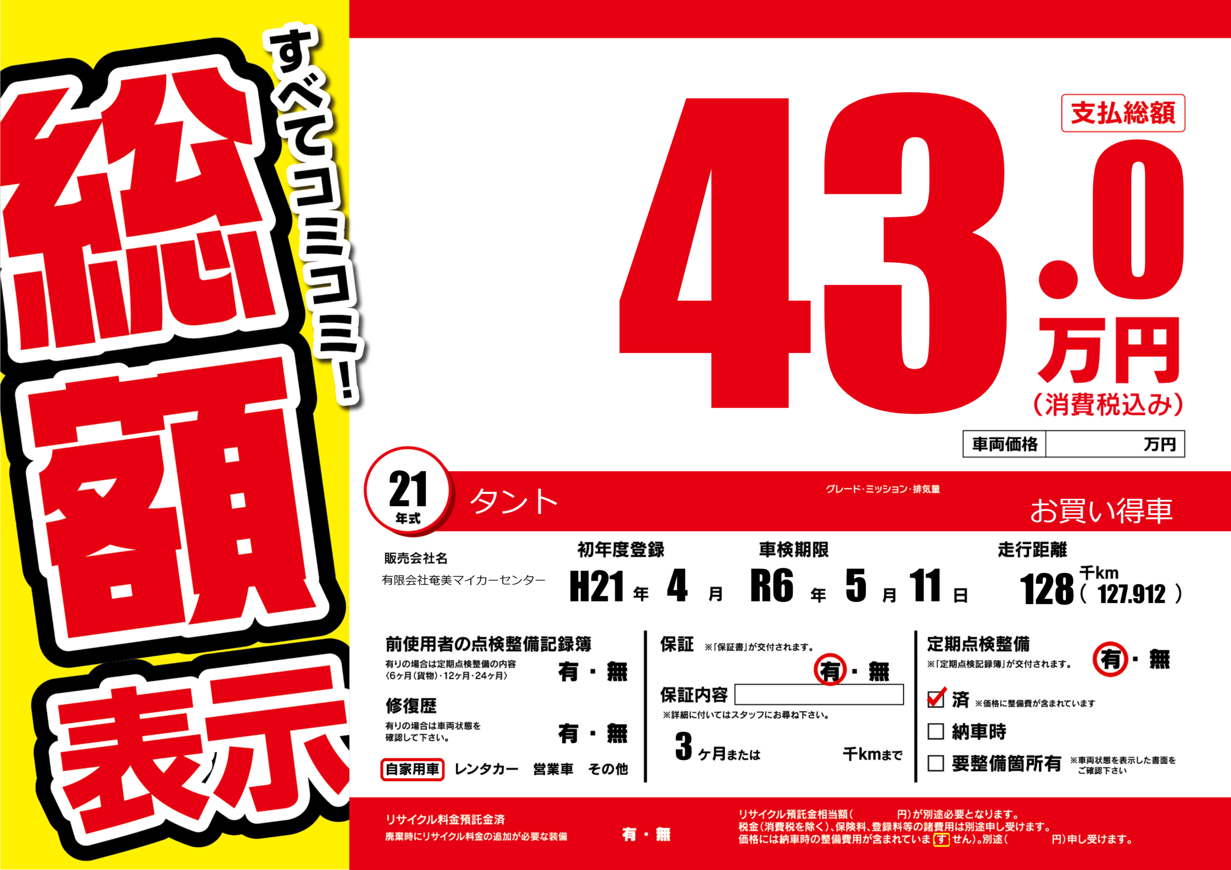| 定期点検整備 | 定期点検整備あり 定期点検整備済み | ||