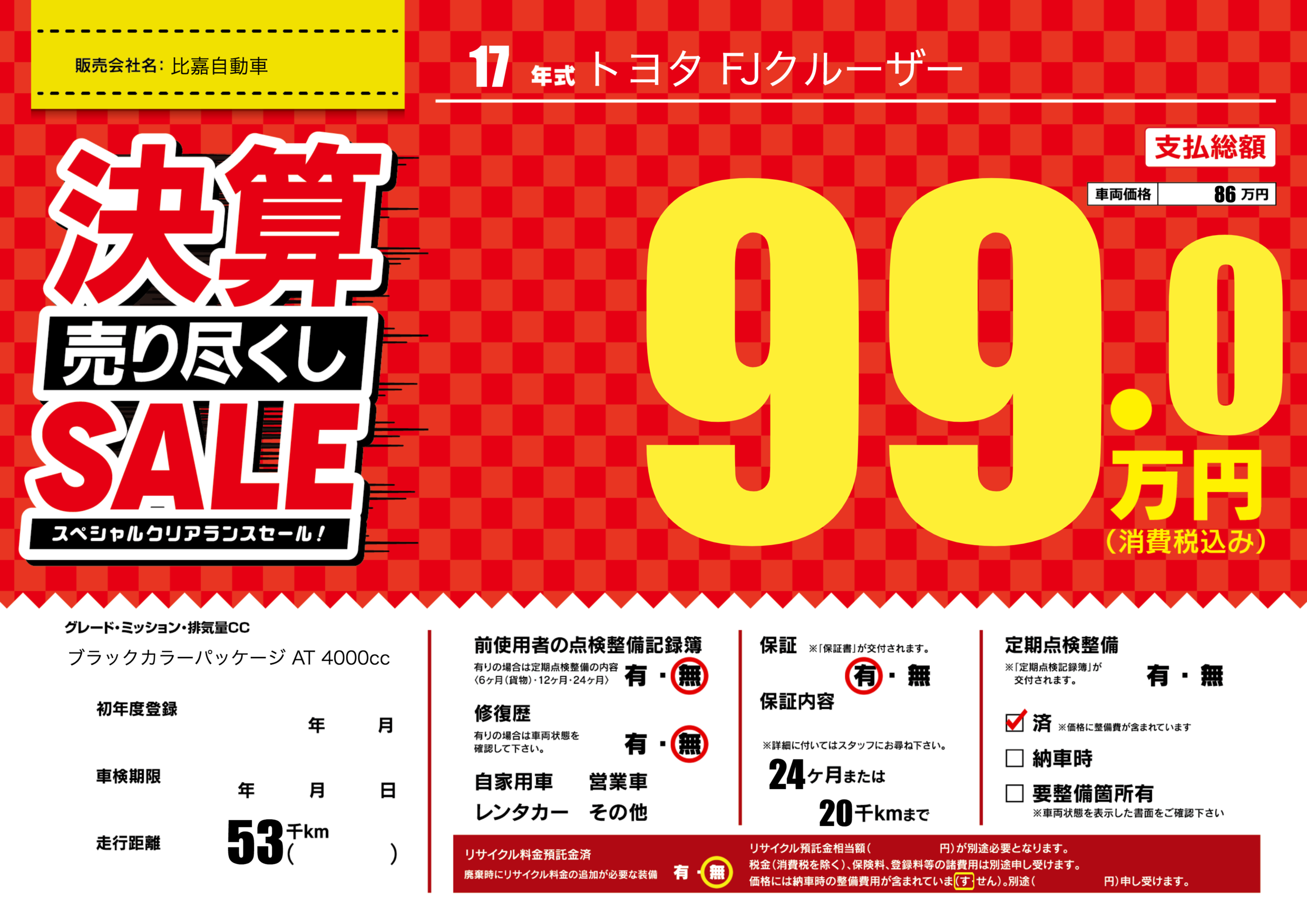 保証付き 保証内容(---) 24ヶ月または(20)千kmまで |