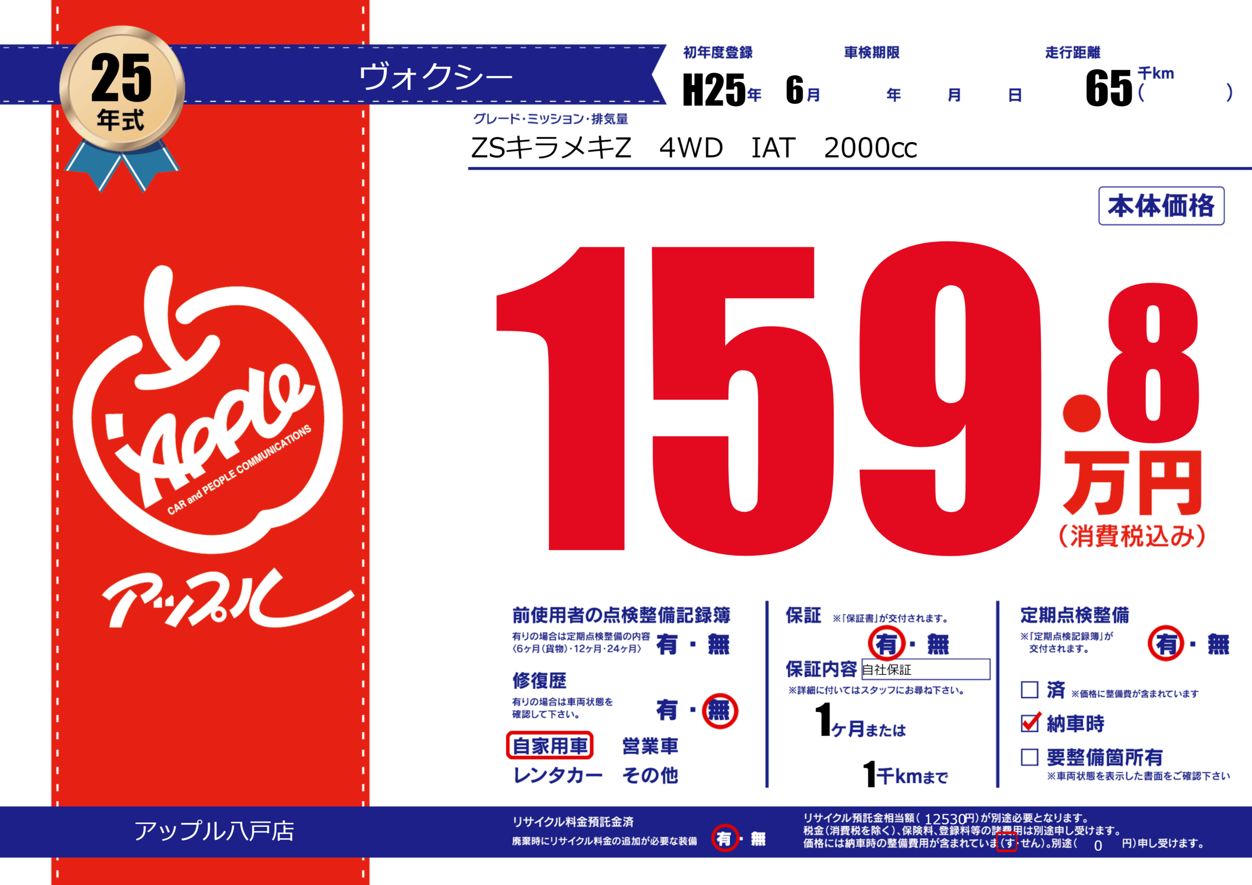| 走行キロ | 6.5万km | 初年度登録 | H25年6月 |