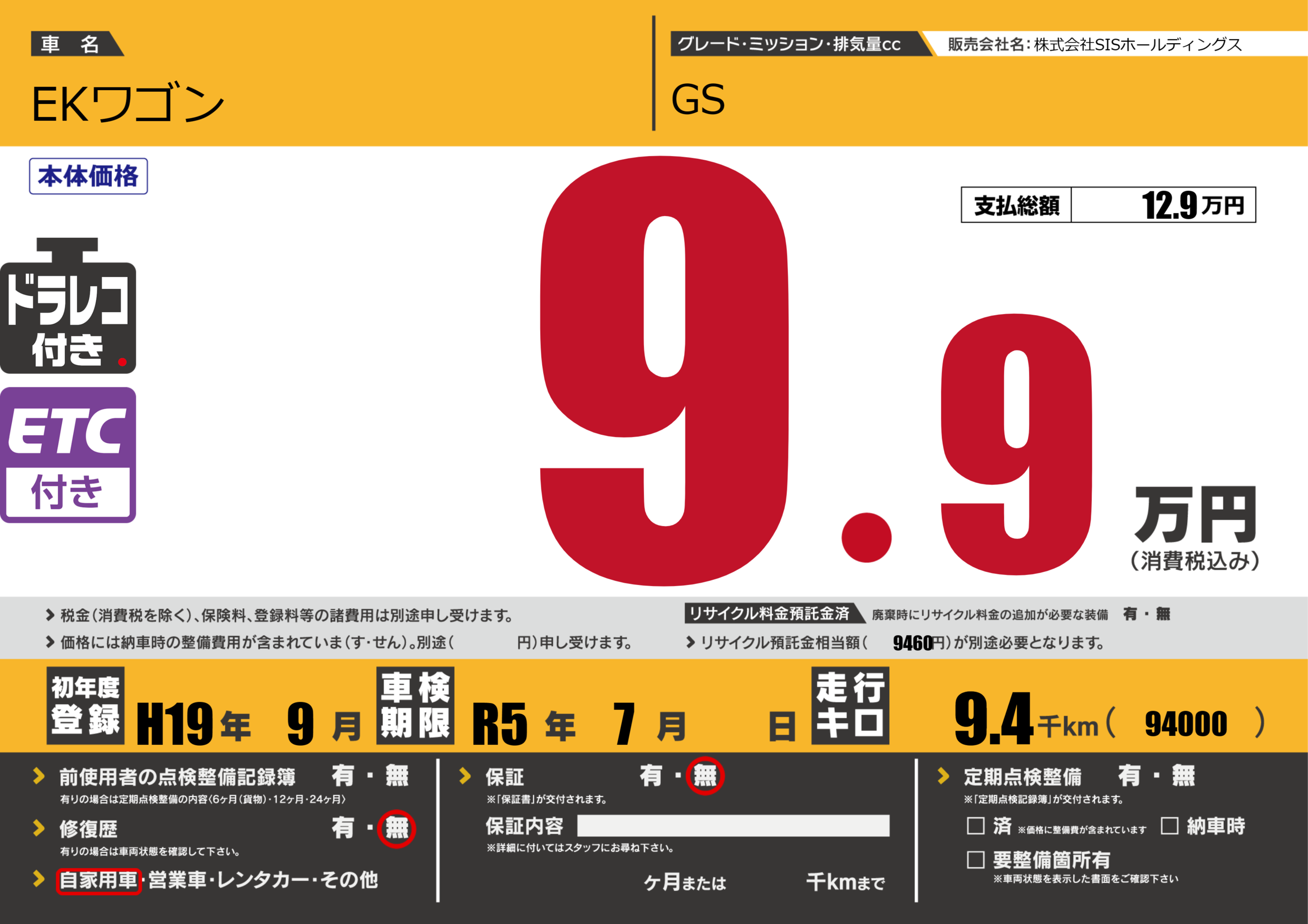 初年度登録 H19年9月