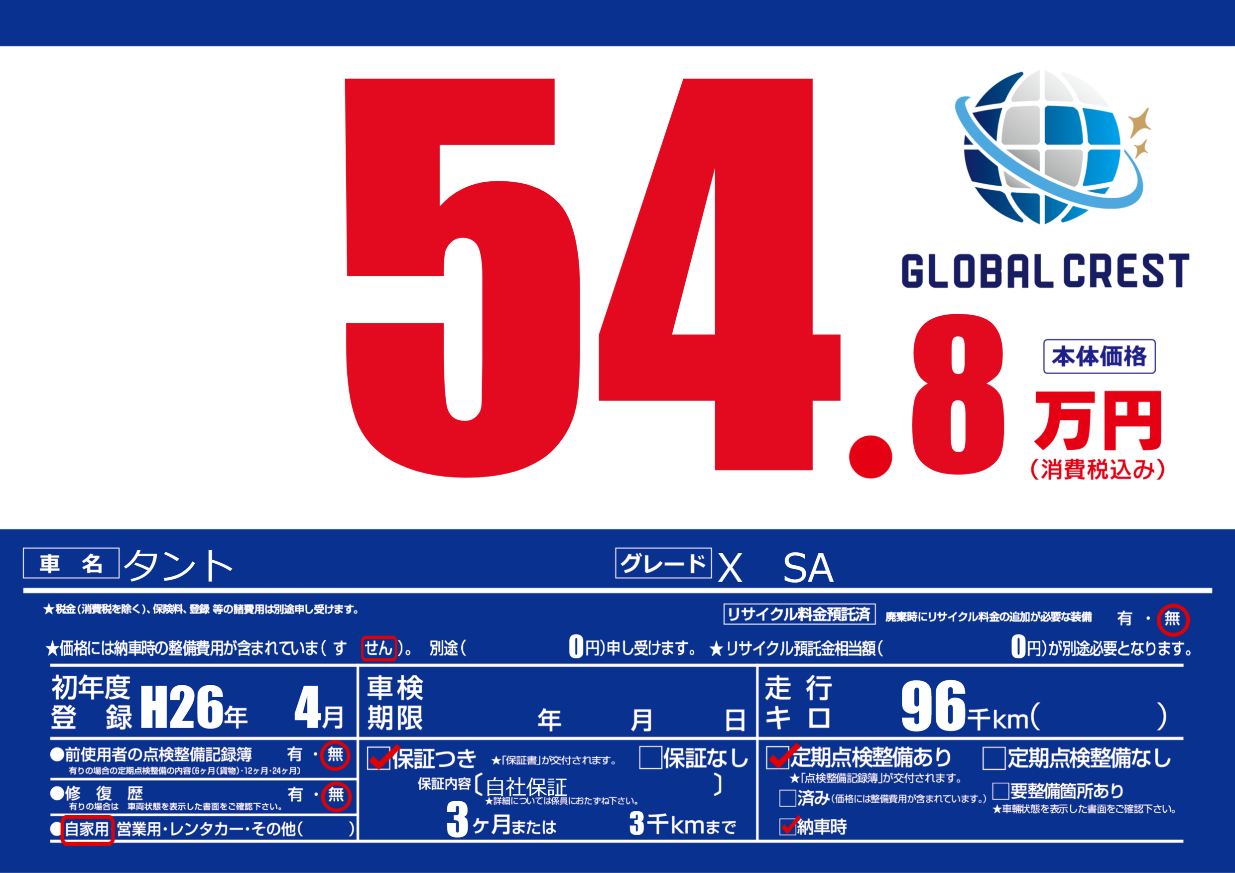 保証付き 保証内容(自社保証) 3ヶ月または3千km |