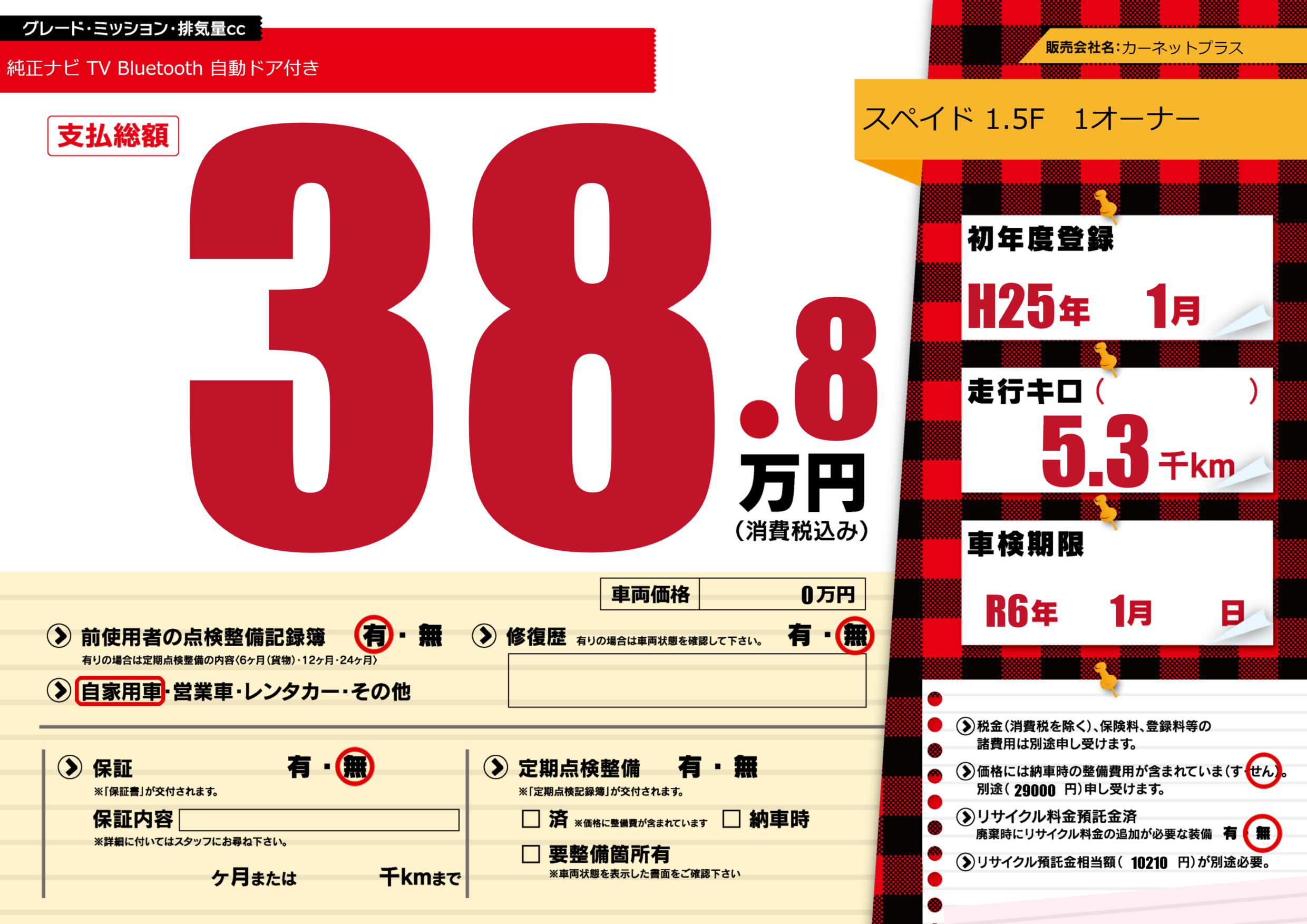 | 車名 | スペイド 1.5F 1オーナー | グレード ミッション 排気量 |
