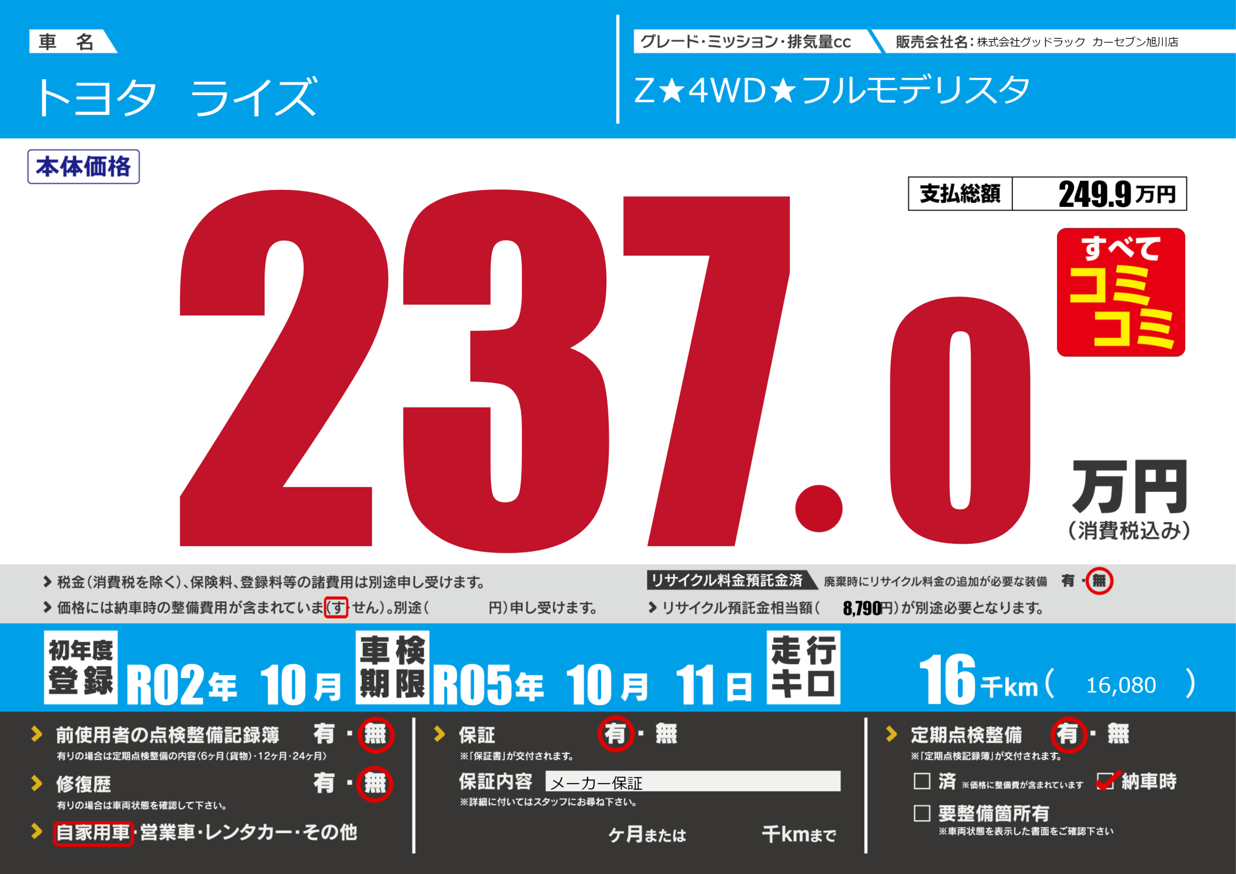 | 車名 | トヨタ ライズ | グレード ミッション 排気量 |