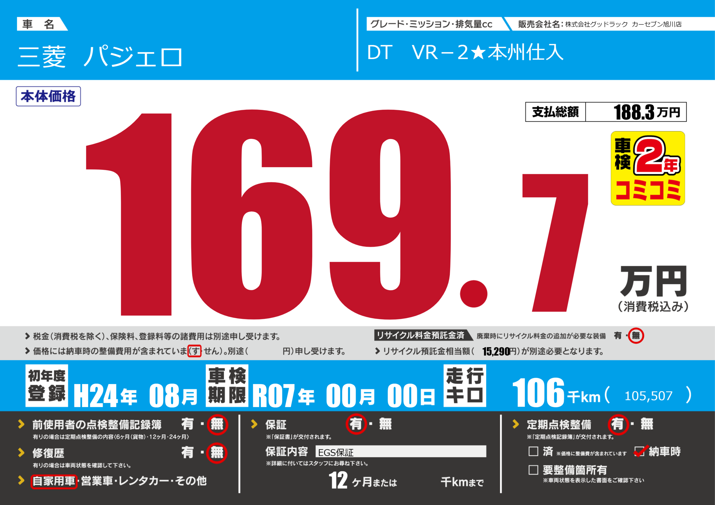 | 車名 | 三菱 パジェロ | グレード ミッション 排気量 |