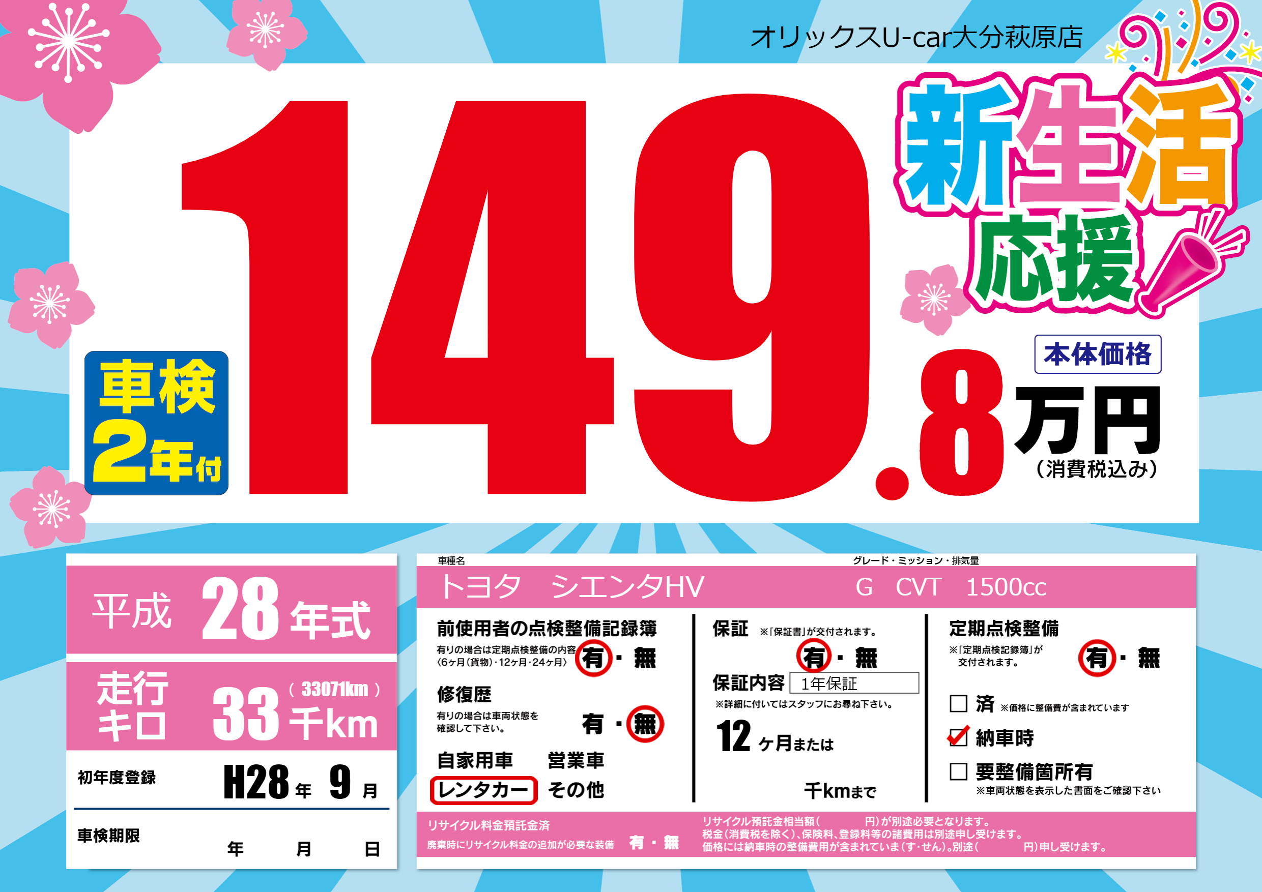 | 車名 | トヨタ シエンタHV | グレード ミッション 排気量 |