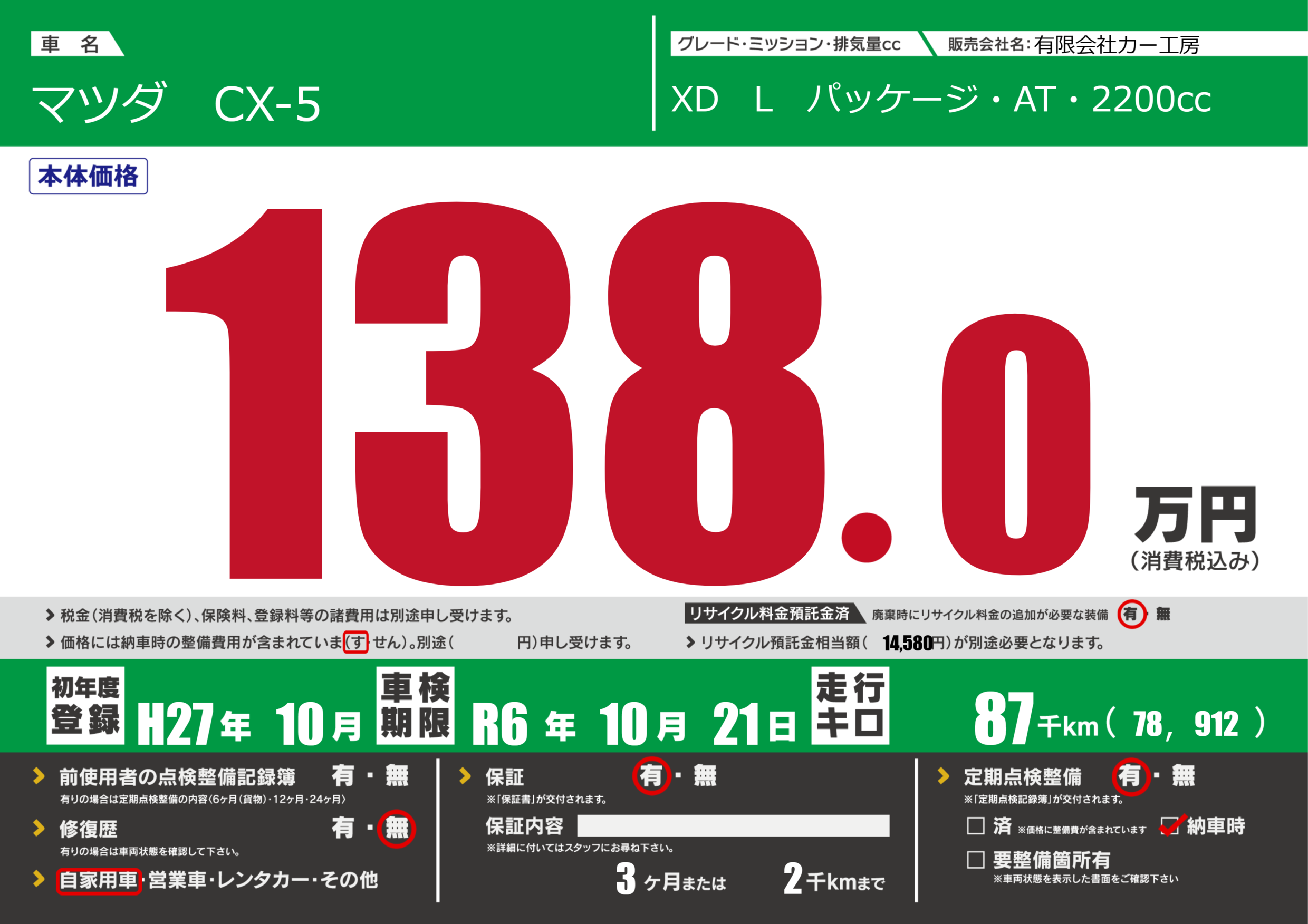 | 車名 | マツダ CX-5 | グレード ミッション 排気量 |
