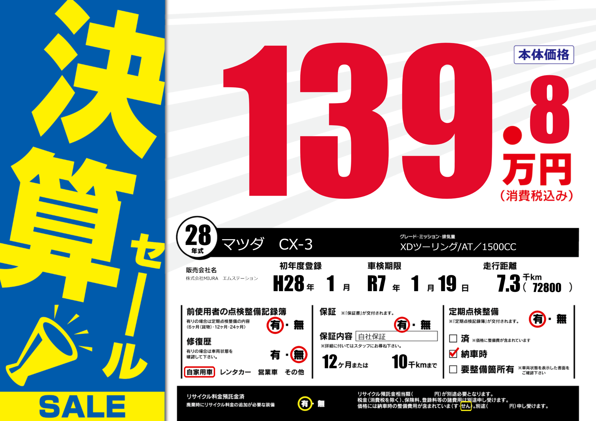 保証付き 保証内容(自社保証) 12ヶ月または(10)千kmまで |