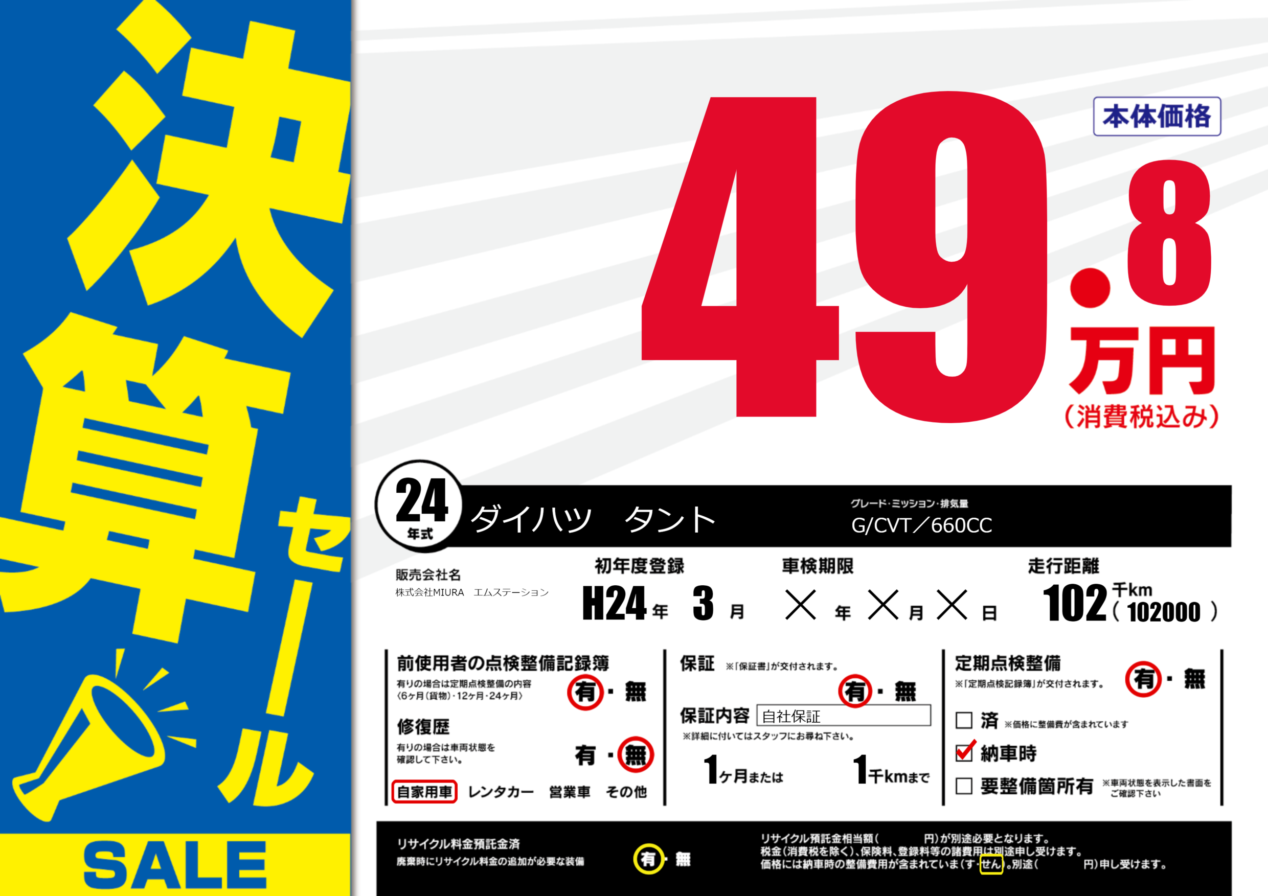 | 車名 | ダイハツ タント | グレード ミッション 排気量 |
