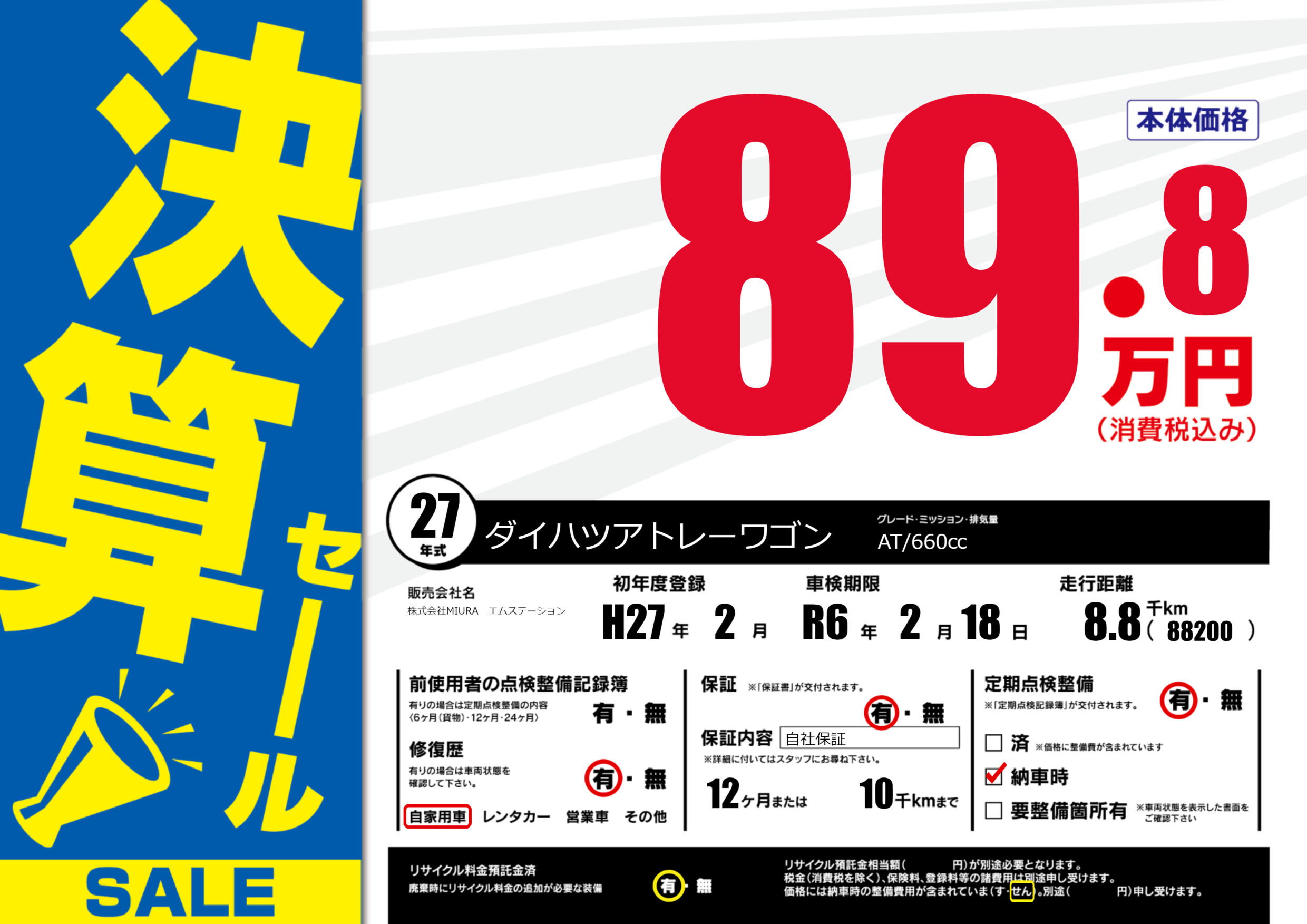 保証付き 保証内容(自社保証) 12ヶ月または(10)千kmまで |
