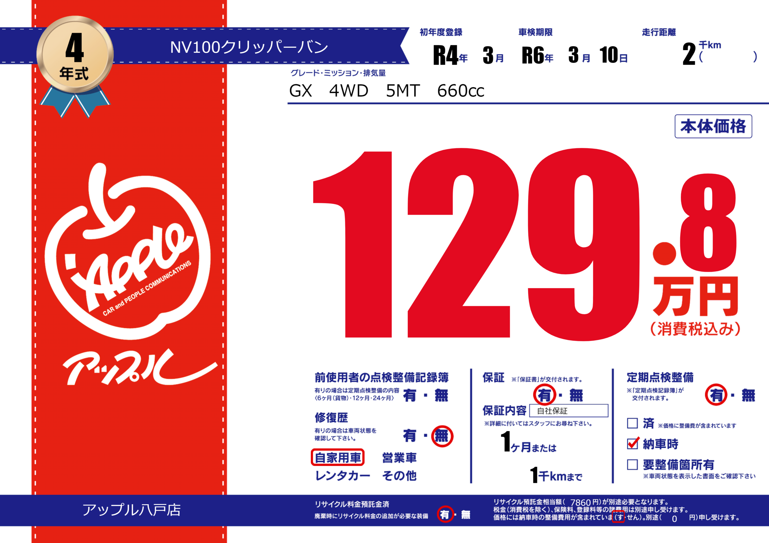 保証付き 保証内容( 自社保証) 1ヶ月または(1)千kmまで |