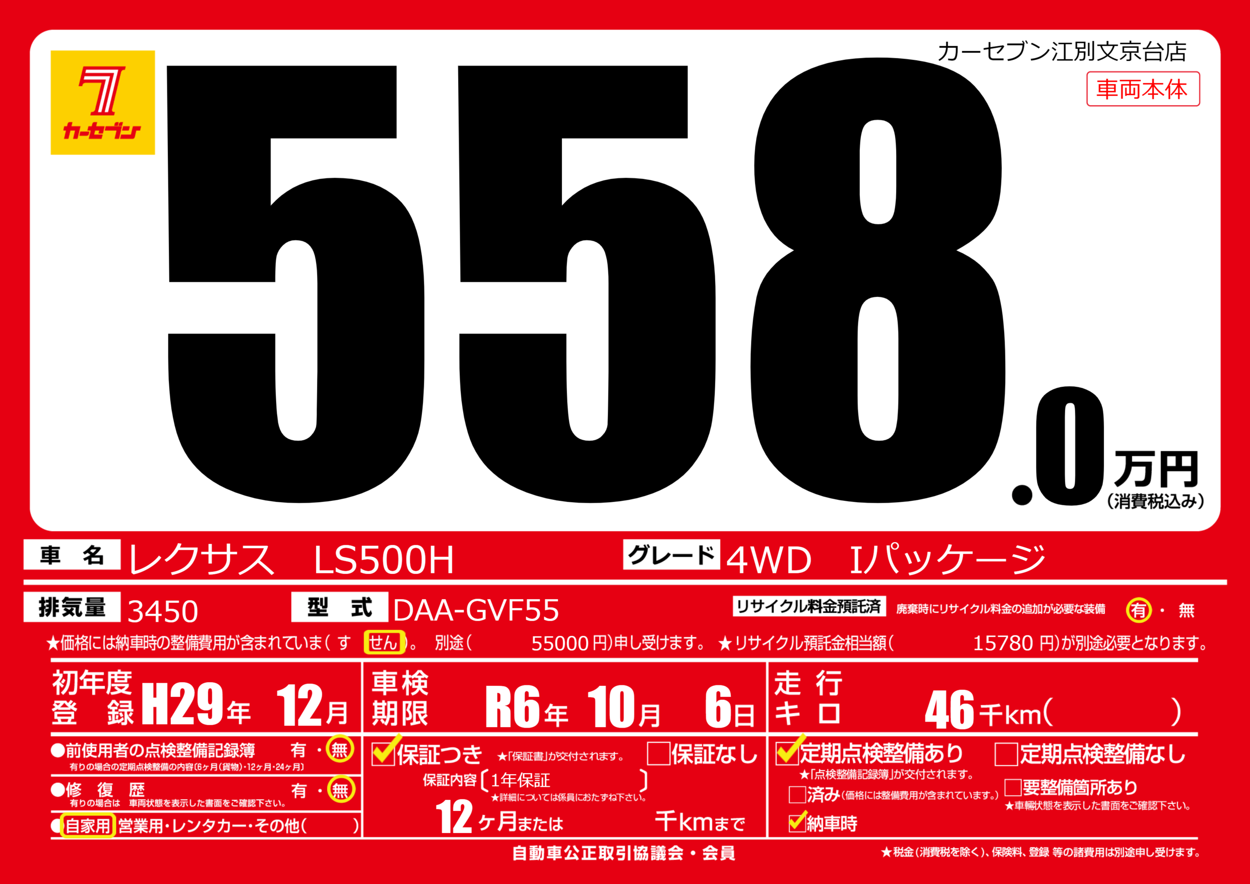 | 車名 | レクサス LS500H | グレード ミッション 排気量 |