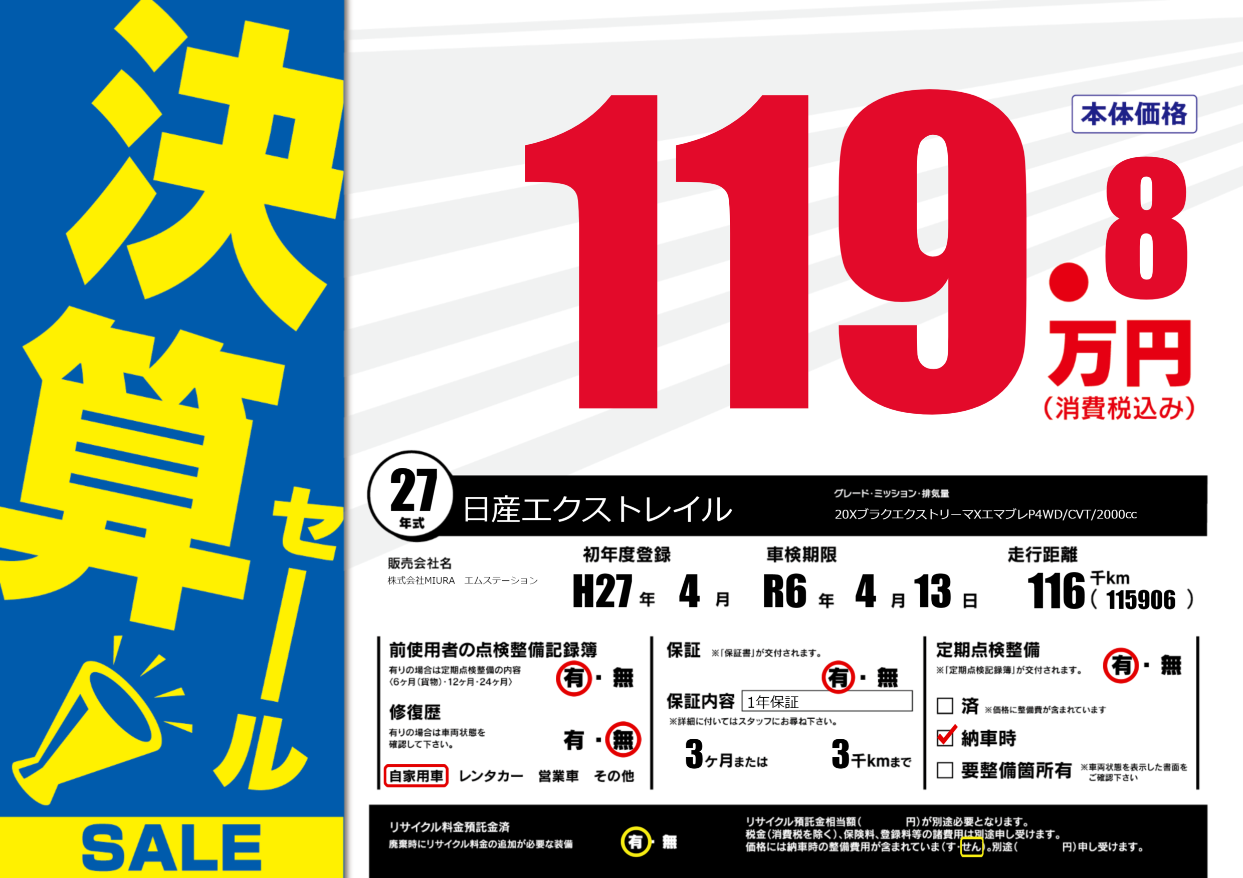 | 走行キロ | 11.6万km | 初年度登録 | H27年4月 |