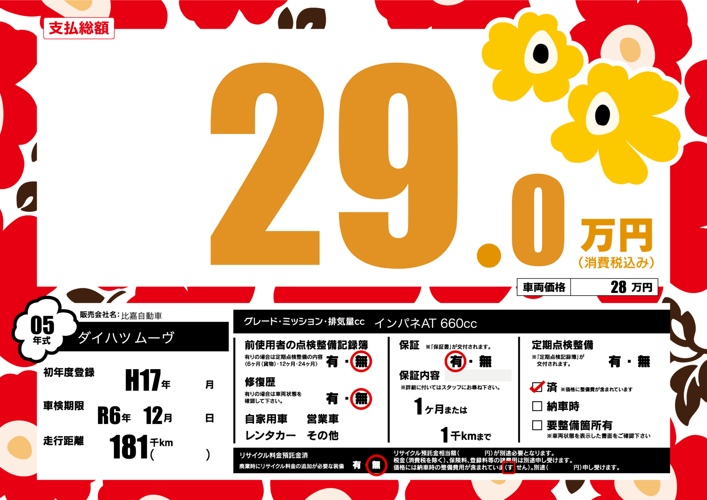 保証付き 保証内容(---) 1ヶ月または(1)千kmまで |