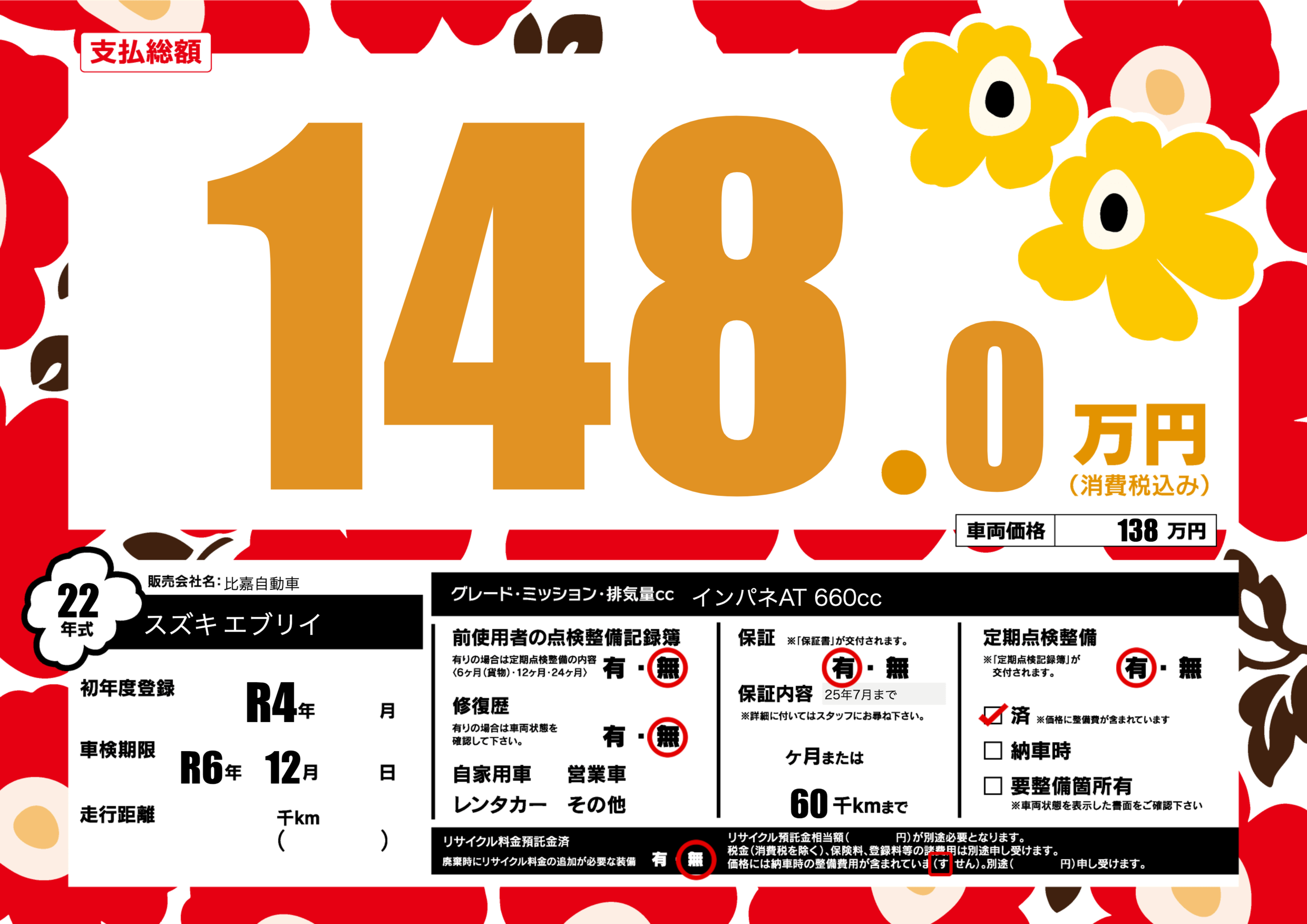 | 定期点検整備 | 定期点検整備あり 定期点検整備済み | ||