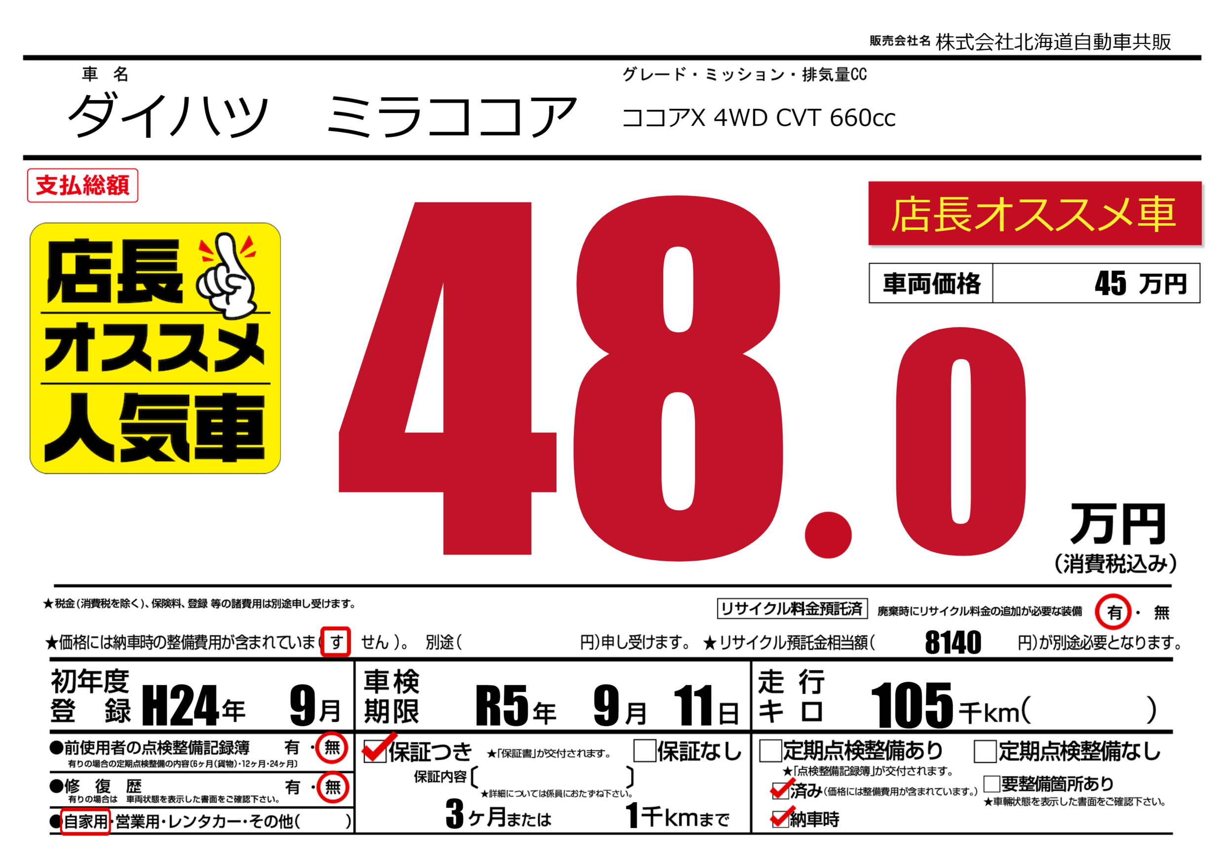 | 定期点検整備 | 定期点検整備済み 納車時あり | ||