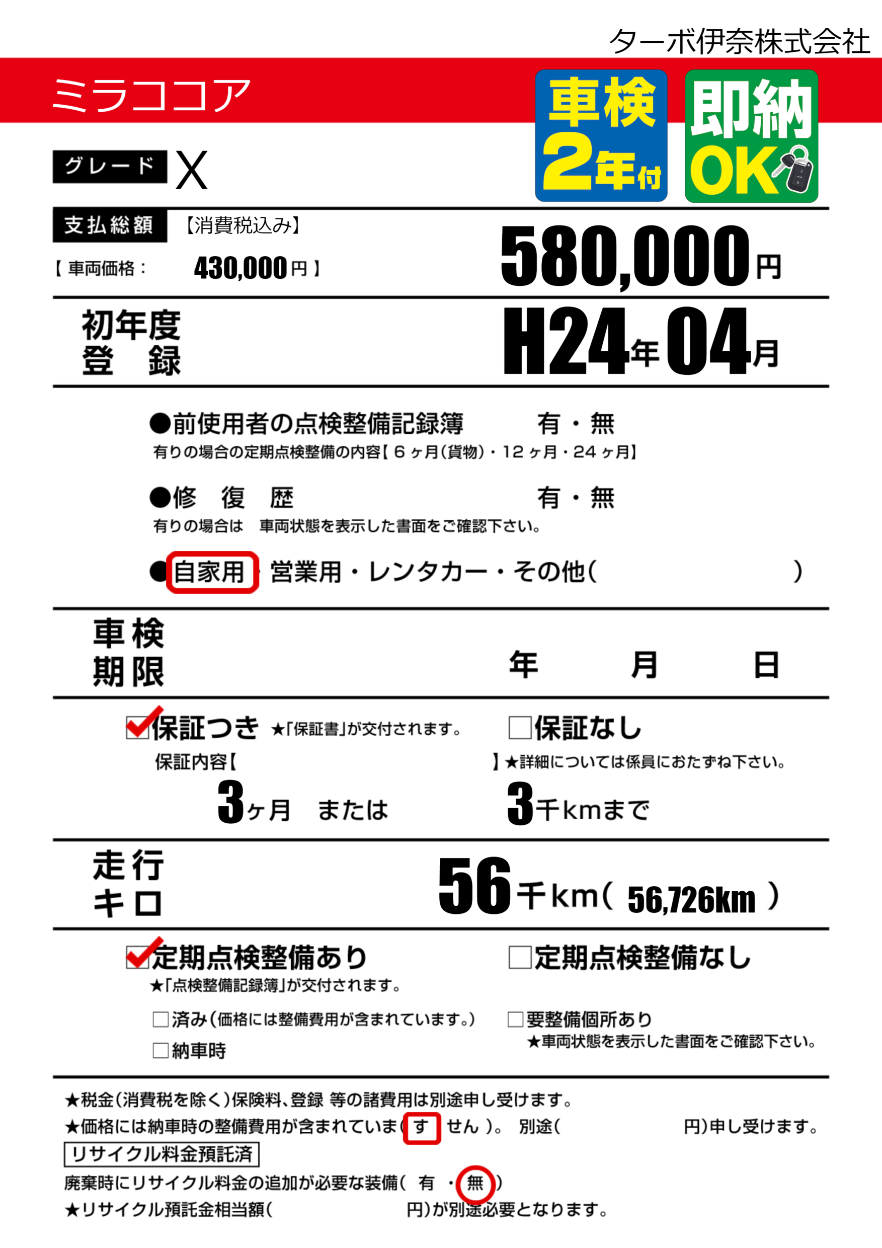 | 車名 | ミラココア | グレード ミッション 排気量 |
