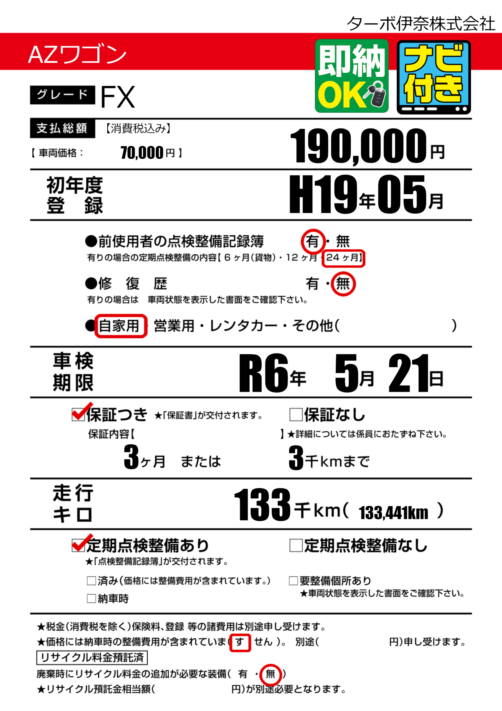 定期点検整備 | 定期点検整備あり |