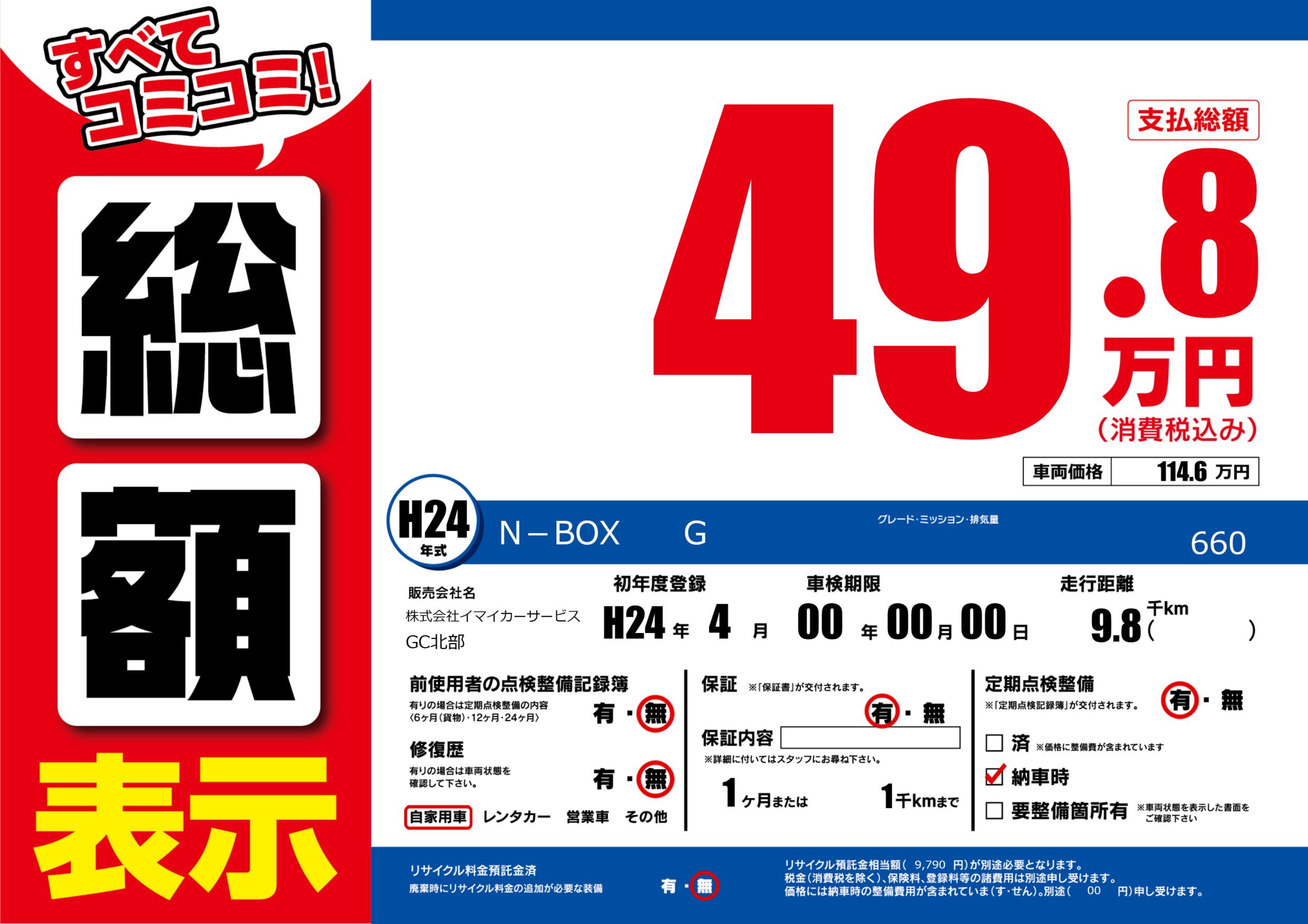 | 車検制限 | 00年 00月 00日 | ||