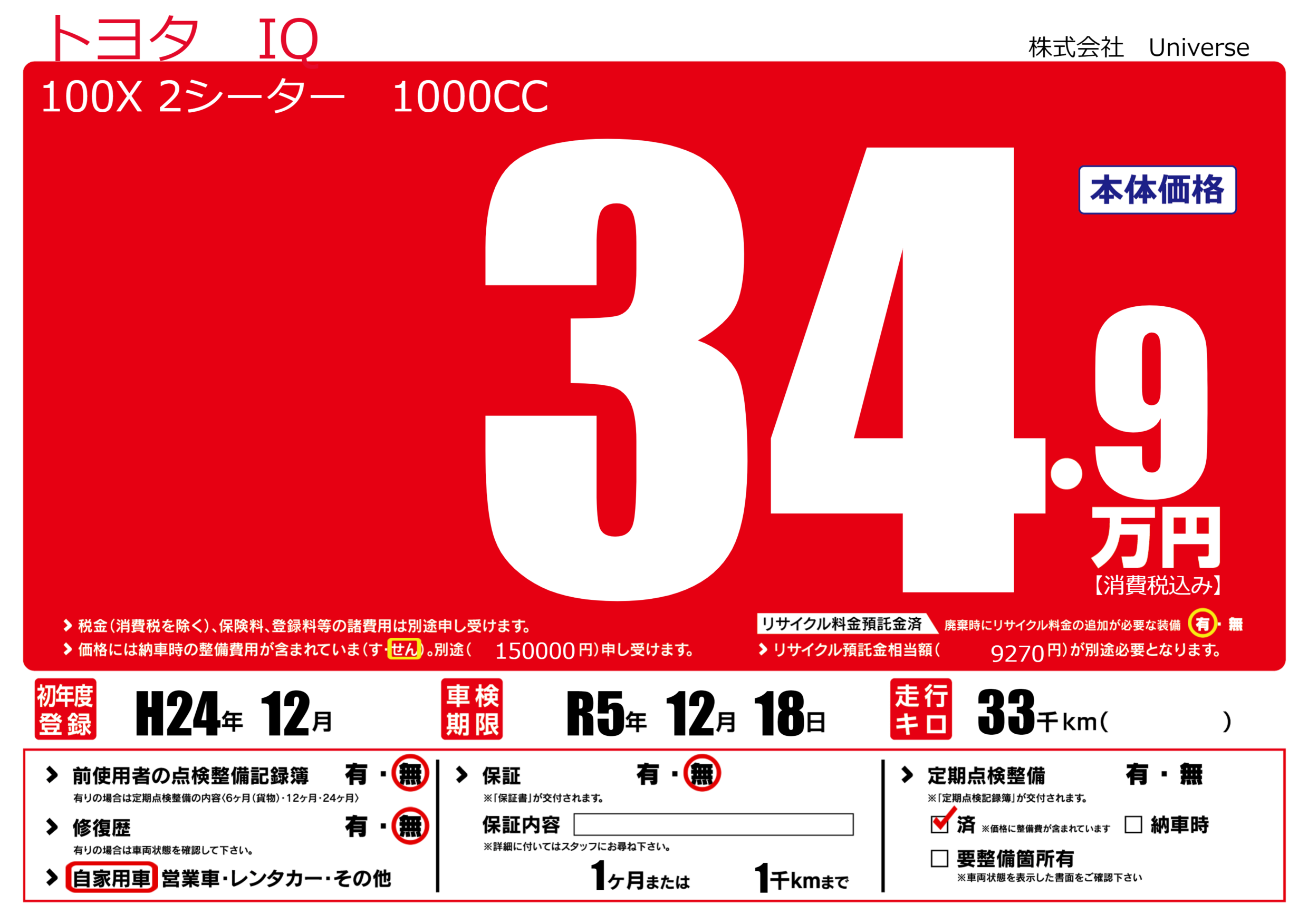| 車名 | トヨタ IQ | グレード ミッション 排気量 |