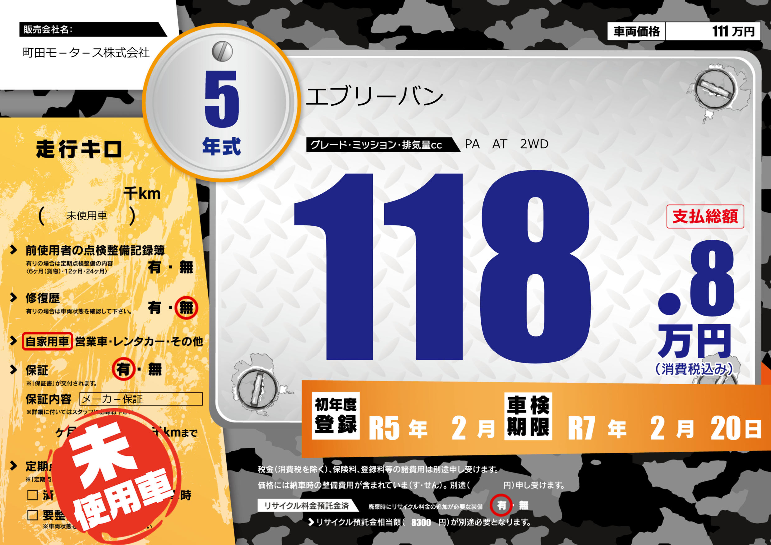 | 走行キロ | - | 初年度登録 | R5年2月 |