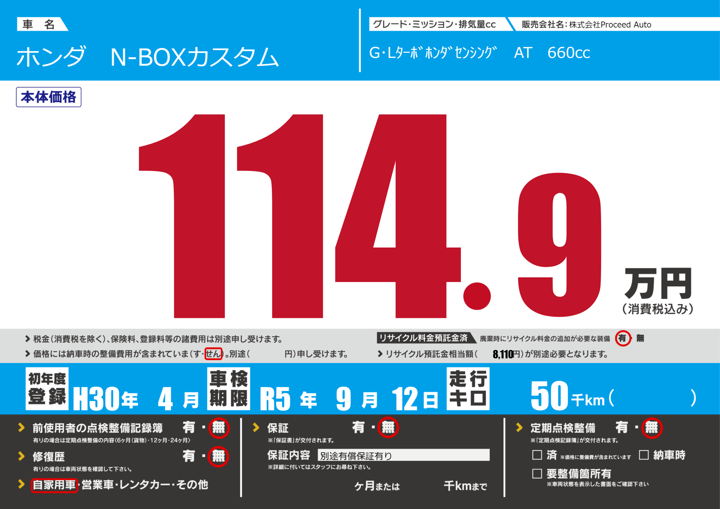 | 走行キロ | 5万km | 初年度登録 | H30年4月 |