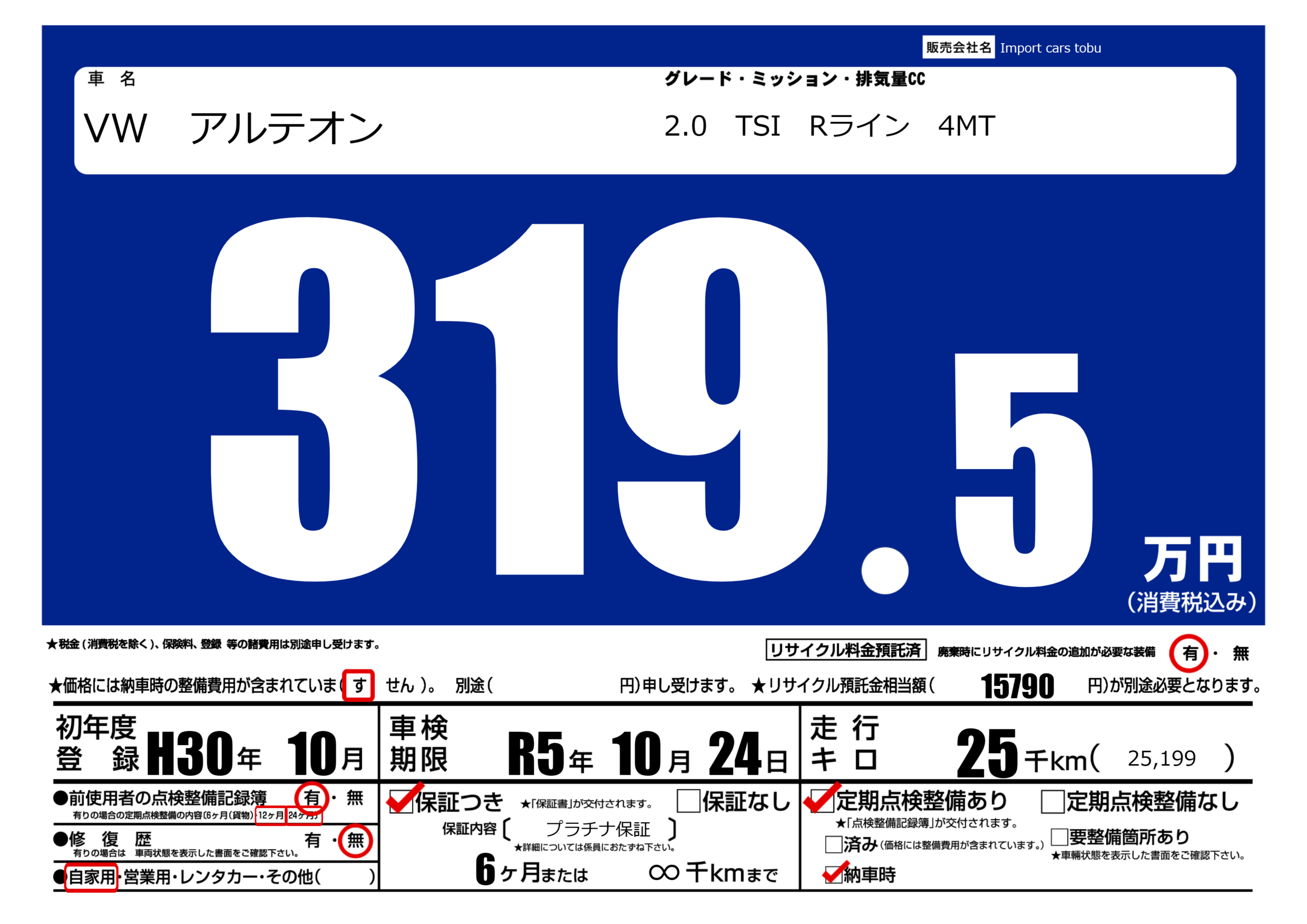| 車名 | VW アルテオン | グレード ミッション 排気量 |