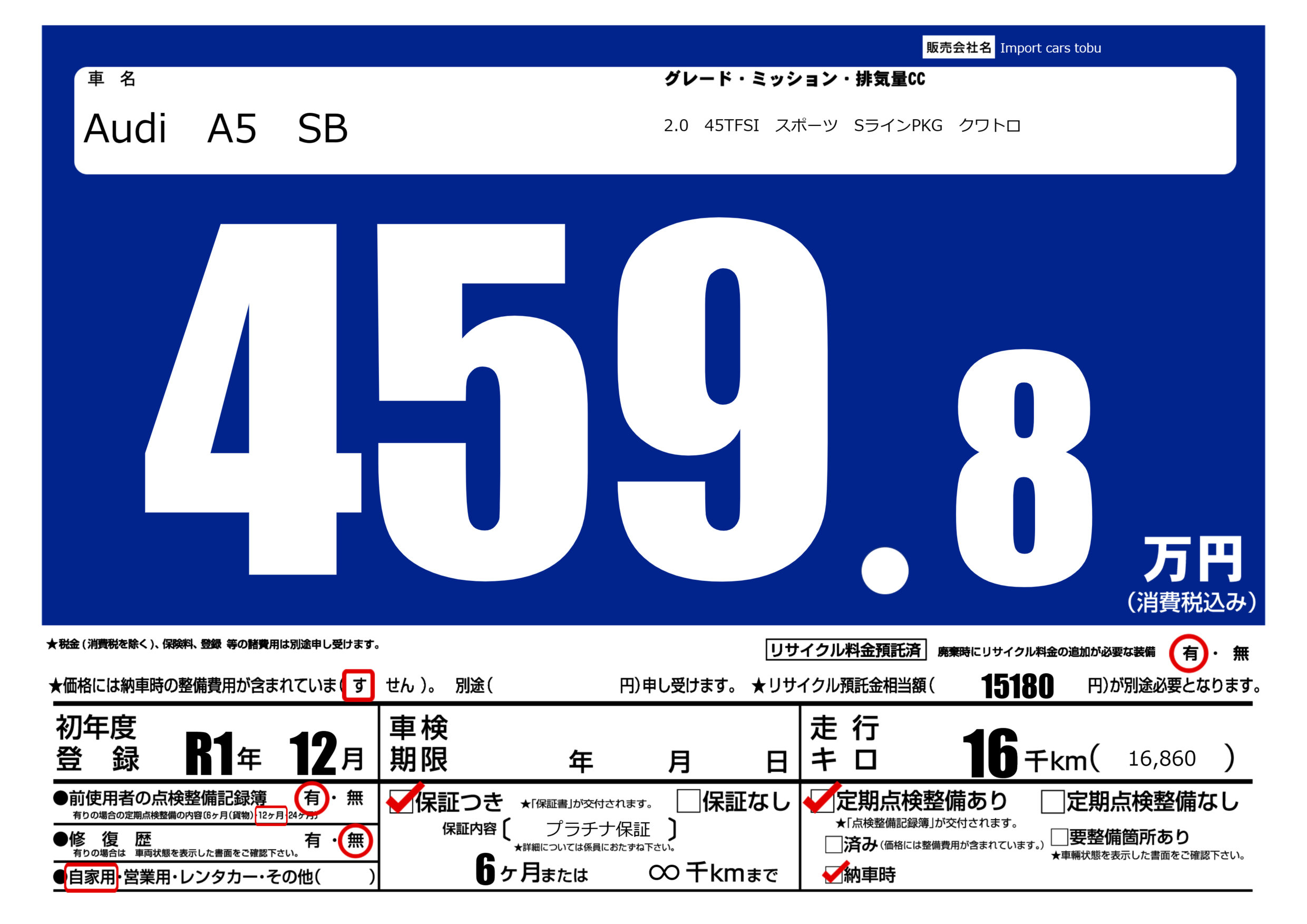 保証付き 保証内容( プラチナ保証) 6ヶ月または(∞)千kmまで |