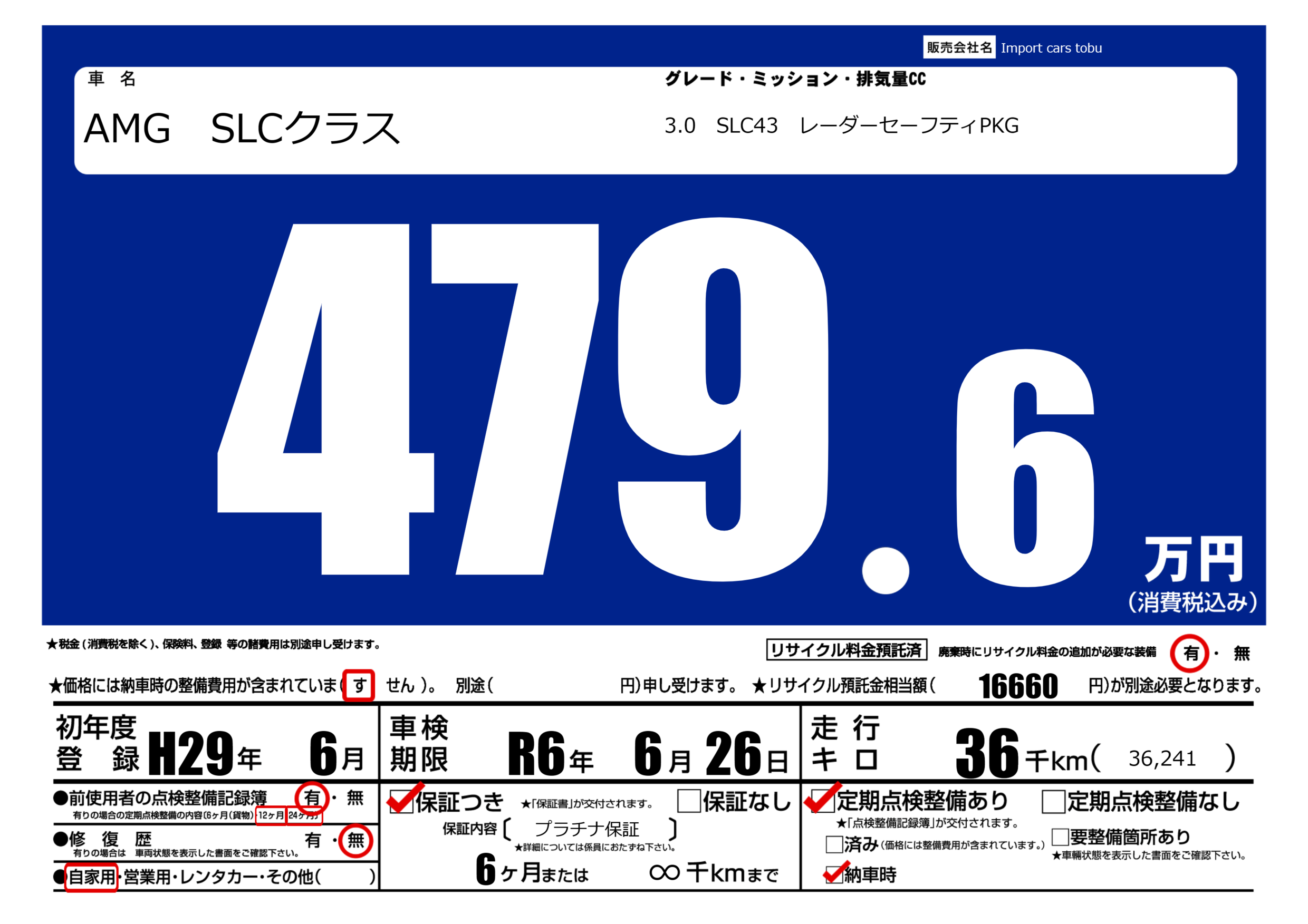 | 車名 | AMG SLCクラス | グレード ミッション 排気量 |