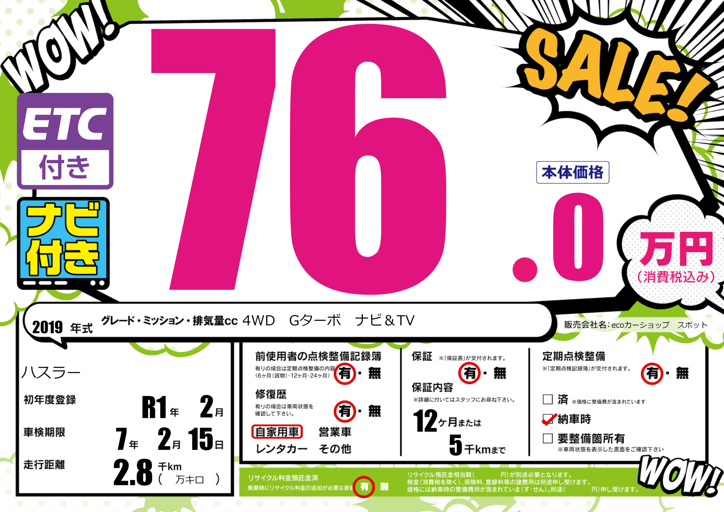 | 車名 | ハスラー | グレード ミッション 排気量 |