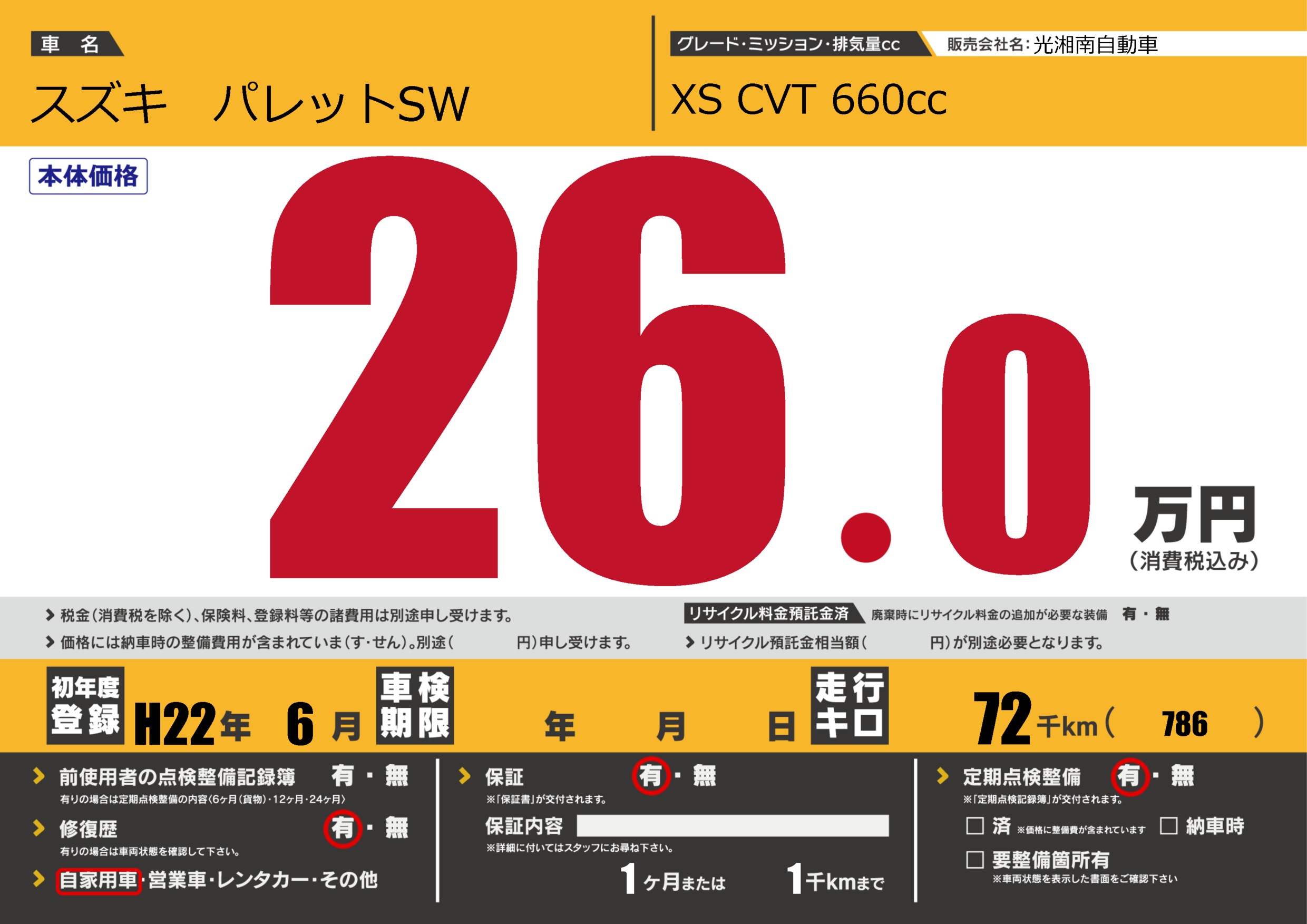| 車名 | スズキ パレットSW | グレード ミッション 排気量 |
