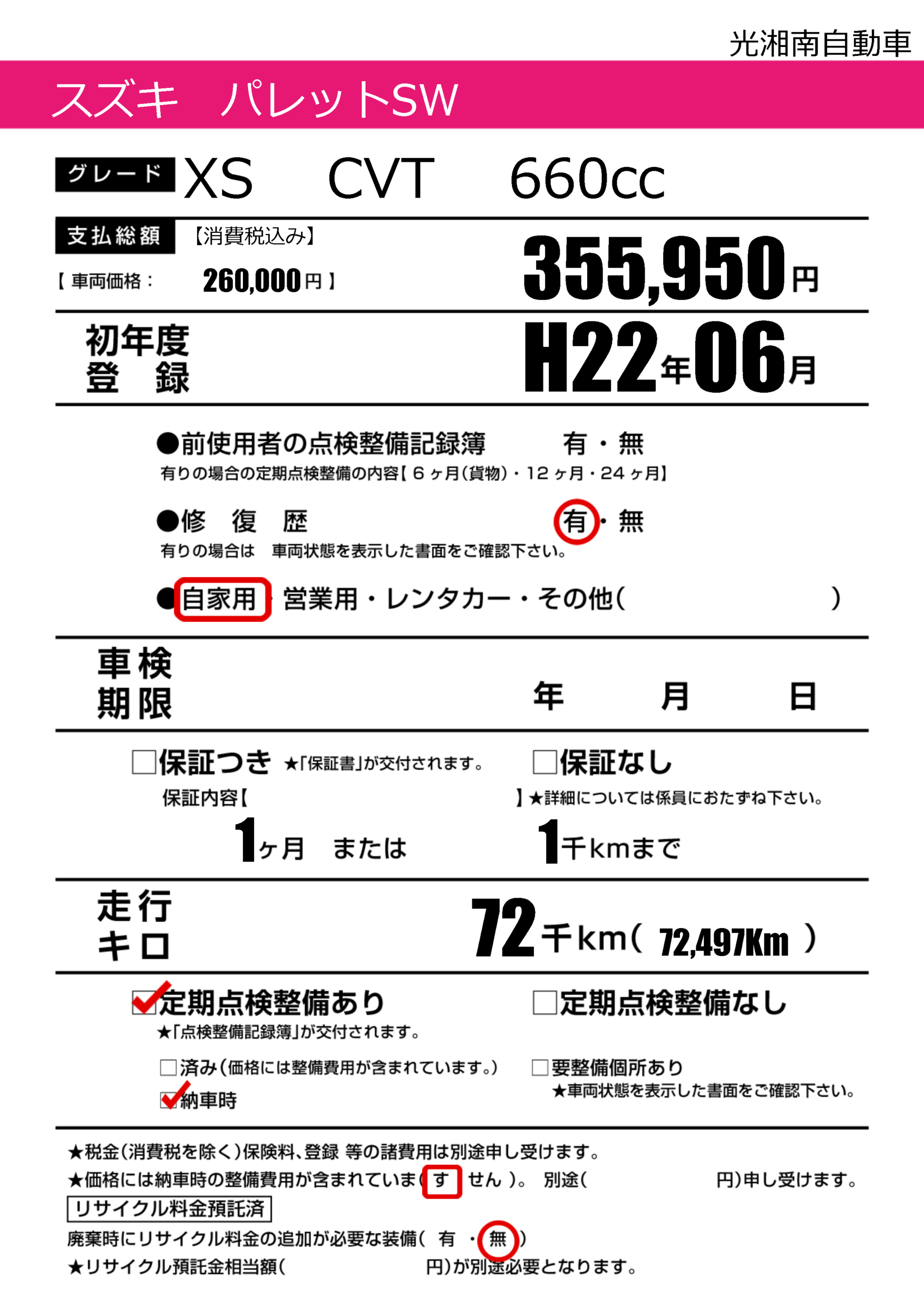 | 車名 | スズキ パレットSW | グレード ミッション 排気量 |