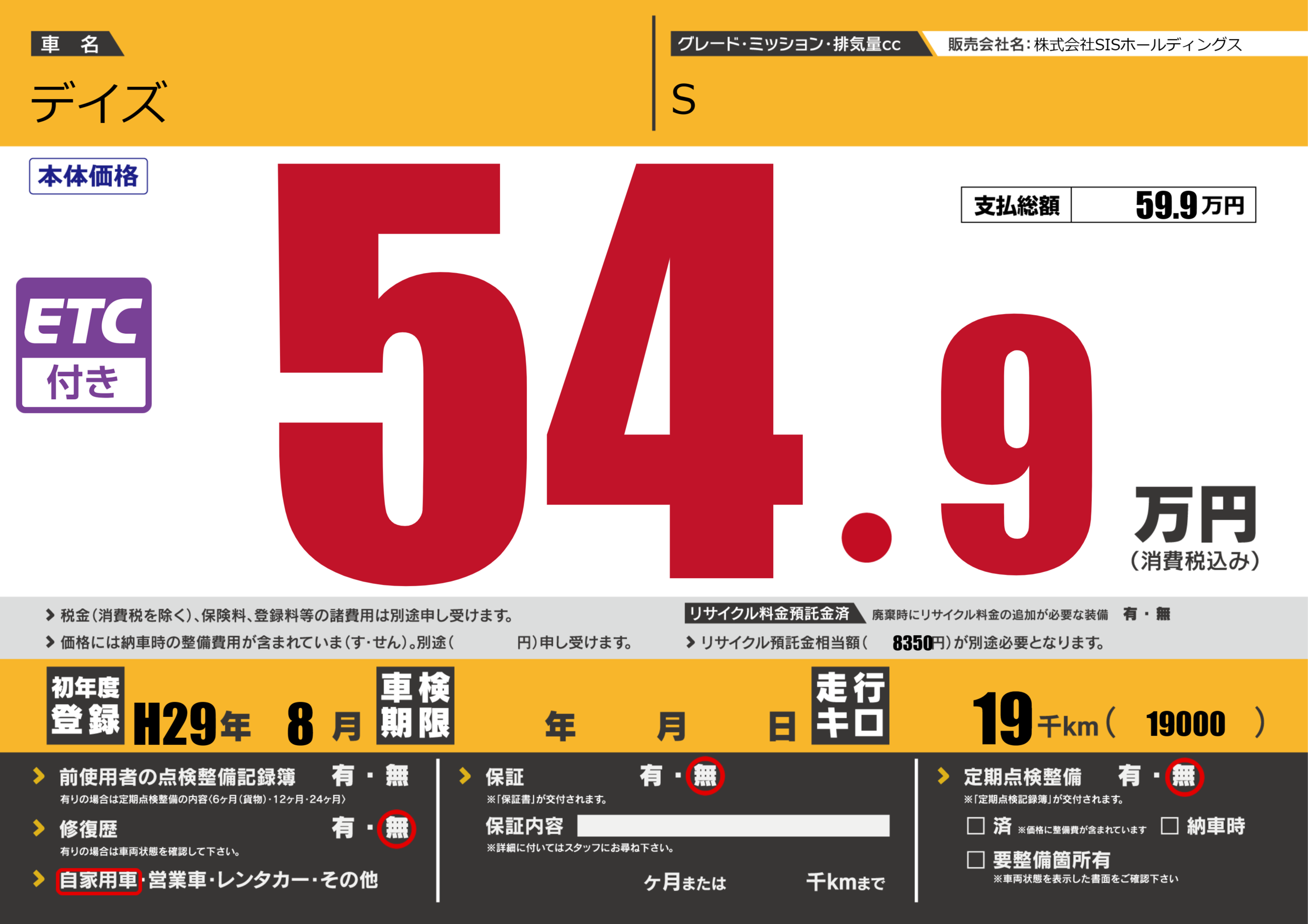 | 走行キロ | 1.9万km | 初年度登録 | H29年8月 |