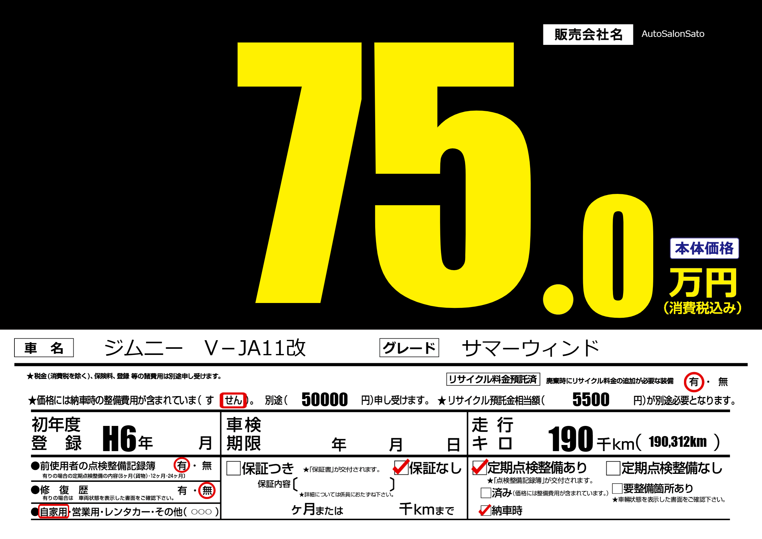 | 車名 | ジムニー V-JA11改 | グレード ミッション 排気量 |