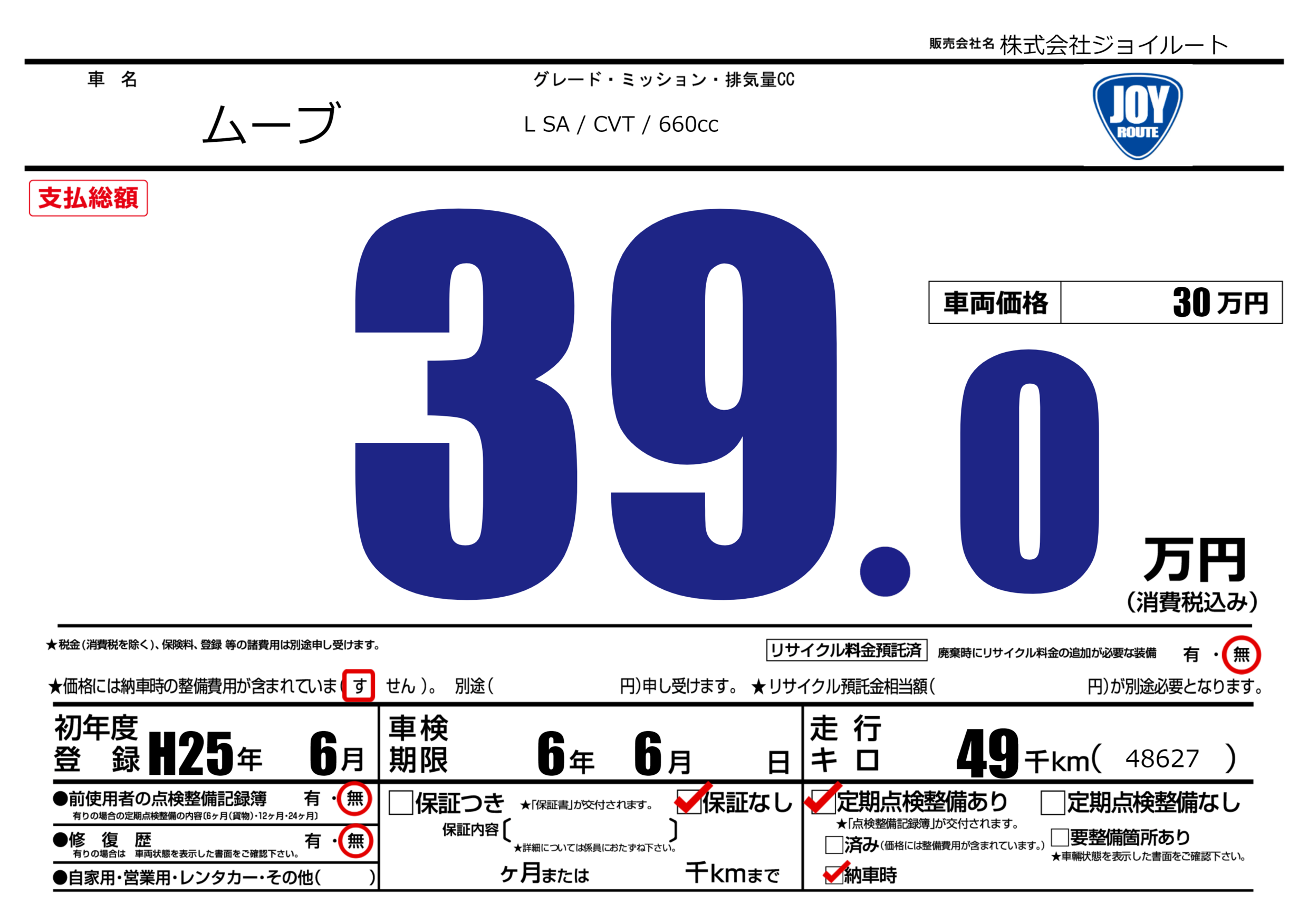 | 走行キロ | 4.9万km | 初年度登録 | H25年6月 |