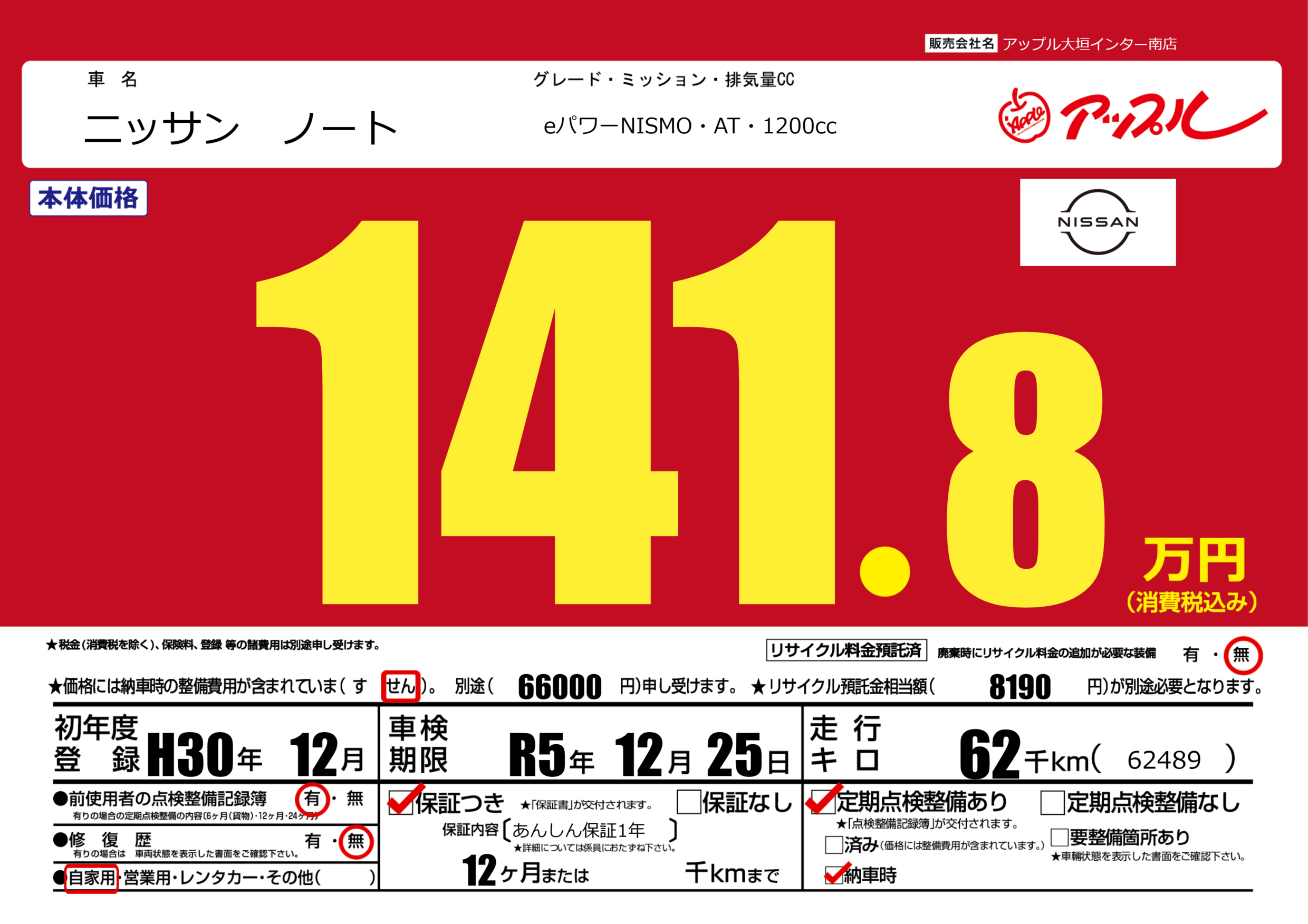 | 車名 | ニッサン ノート | グレード ミッション 排気量 |