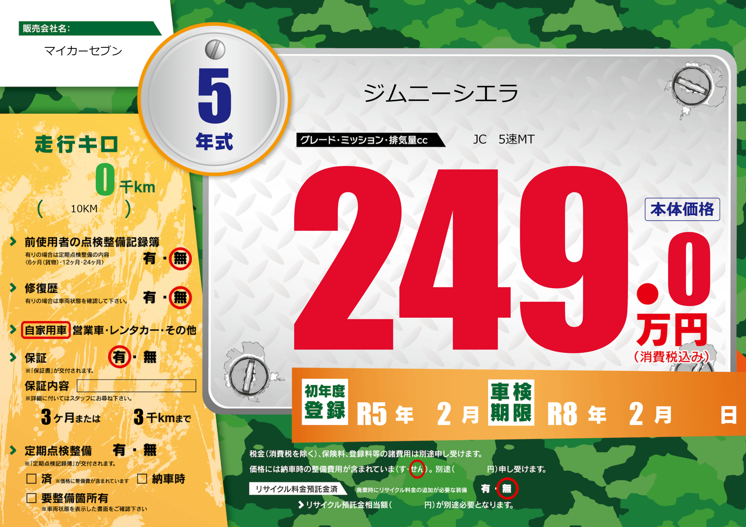 | 車名 | ジムニーシエラ | グレード ミッション 排気量 |